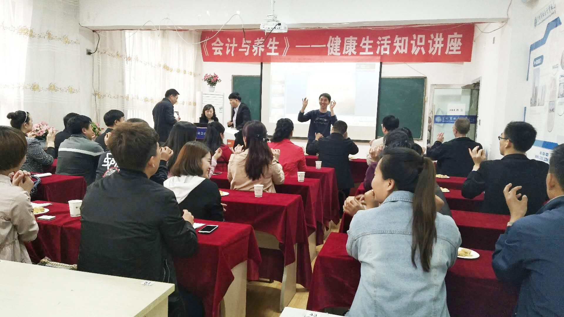 本次讲座学校特别邀请了甘肃省健康管理研究会会长、兰大二院主任医师文惠方,甘肃政法学院教授、兰州大学营养与健康研究中心硕士生导师、精准营养学院副院长、甘肃省健康管理研究会副会长、国家高级健康管理师曾明,甘肃省健康管理研究会会员、甘肃省太极拳协会秘书长王宏毅,甘肃省健康管理研究会副秘书长赵润元前来分享会计与养生的专业知识。(讲座现场)