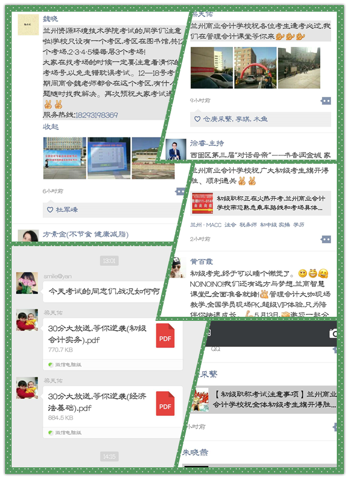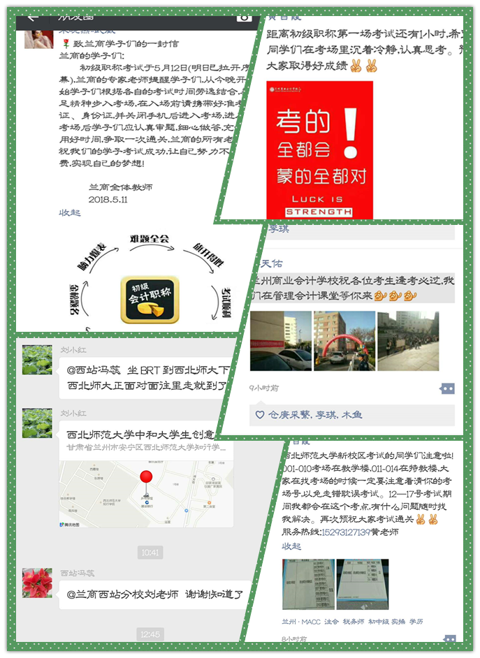 另外,兰州商业会计学校的老师还运用微信、QQ、班级群、备考群、朋友圈等渠道,即时为考生答疑解惑,为考生送祝福。