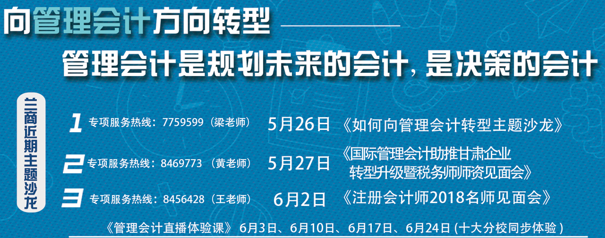 会计人的考证和发展之路是艰难漫长的,初级只是考生们的基本的试炼,如何在会计职业发展路途上走的更远?会计人员考完初级职称,还应该干些什么?兰州商业会计学校的老师针对不同会计学习人群给出了不同的方案! 在会计初级考试结束之后,兰州商业会计学校将隆重举办几期主题沙龙,助力会计人员转型升级。打算在会计职业道路上走得更远的小伙伴也可以通过我校主题沙龙了解会计发展趋势,提升自身业务能力。(兰商近期主题沙龙)