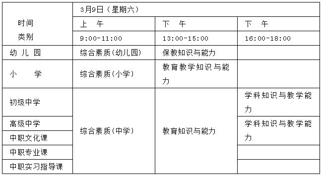 2019年上半年NTCE笔试日期为3月9日,各科目考试时间为120分钟,具体日程安排如下表: