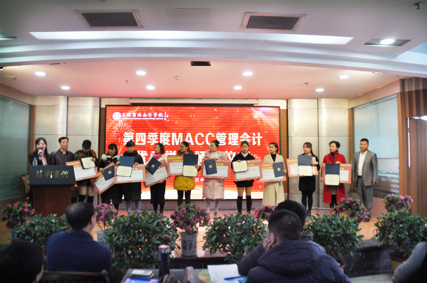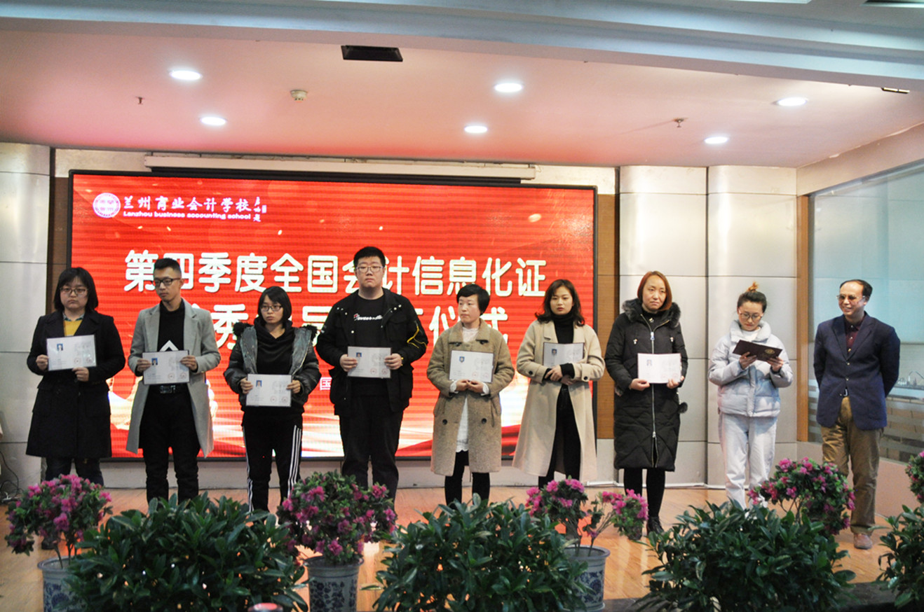 甘肃首届MACC管理会计2018年第四季度考试、甘肃省全国会计信息化应用能力2018年第四季度考试在兰州商业会计学校组织下顺利完成,考生们都取得了非常优异的成绩,成功拿下管理会计证书、会计实务信息化应用能力证书。在本次活动上,兰州商业会计学校祁校长、王书记、包老师、贾老师为通过考试的优秀学员颁发证书、奖学金,并合影留念。