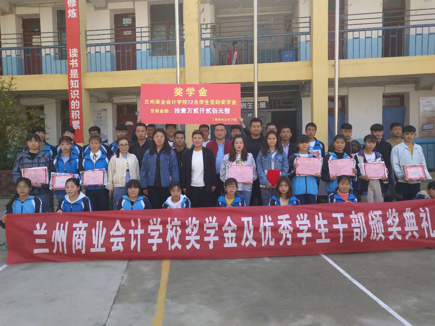 又是一年春光好,正当扬帆奔前程。在这个春意盎然、草长莺飞的季节。4月15日下午14:30我校全体师生在操场集会,隆重举行2017-2018年度奖学金及优秀学生干部颁奖典礼。此次评优活动是根据兰州商业会计学校2018年第91号文件精神,在评优工作领导小组的统筹规划和集中管理下,对全校符合评选条件的同学在公开、公平、公正和民主集中的原则下,严格按照程序组织评选的。最终,共有72名学习成绩优秀的学生获得奖学金,共计奖金112200元整。共有44名学生获得“优秀学生干部”荣誉称号。