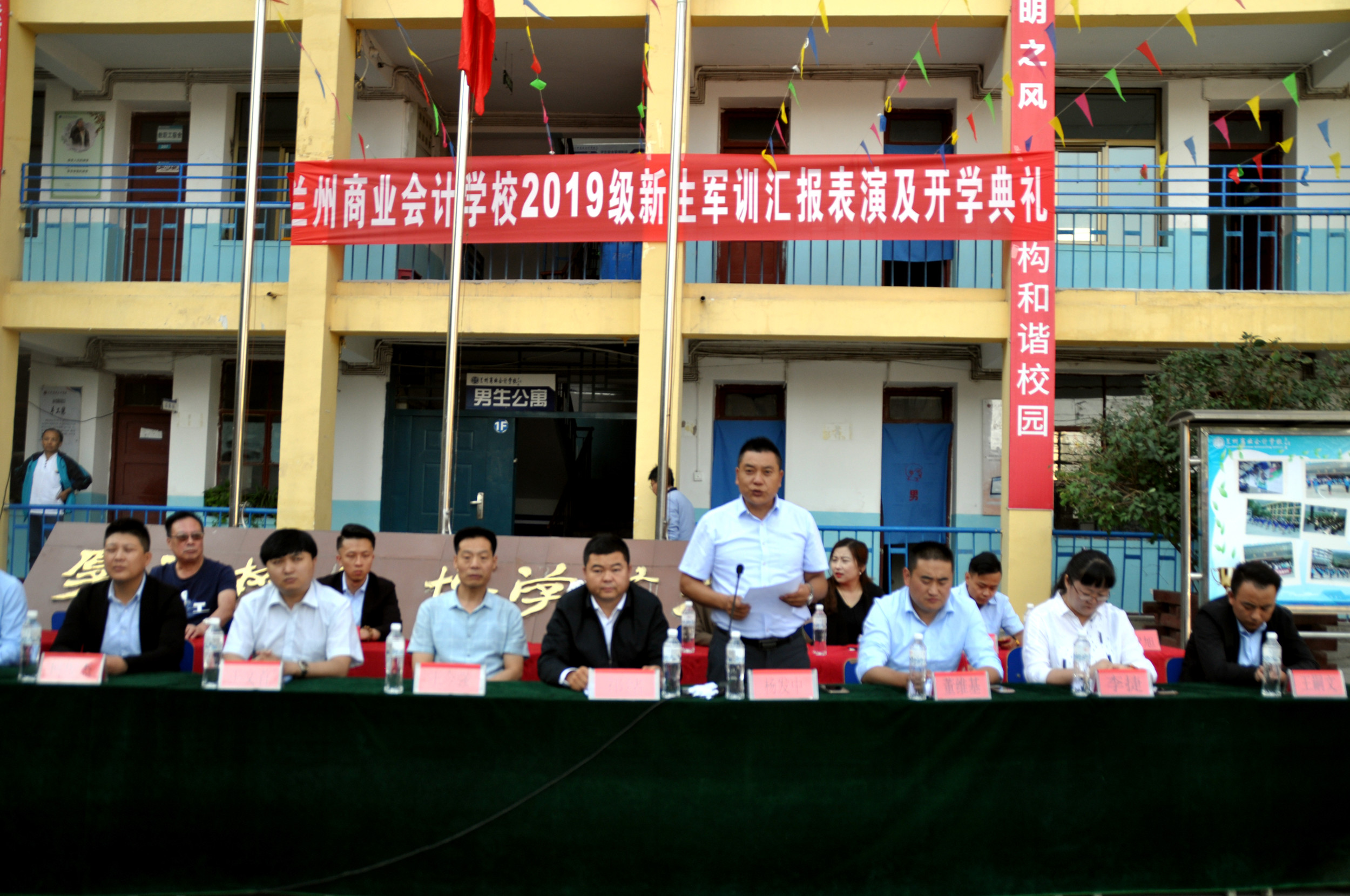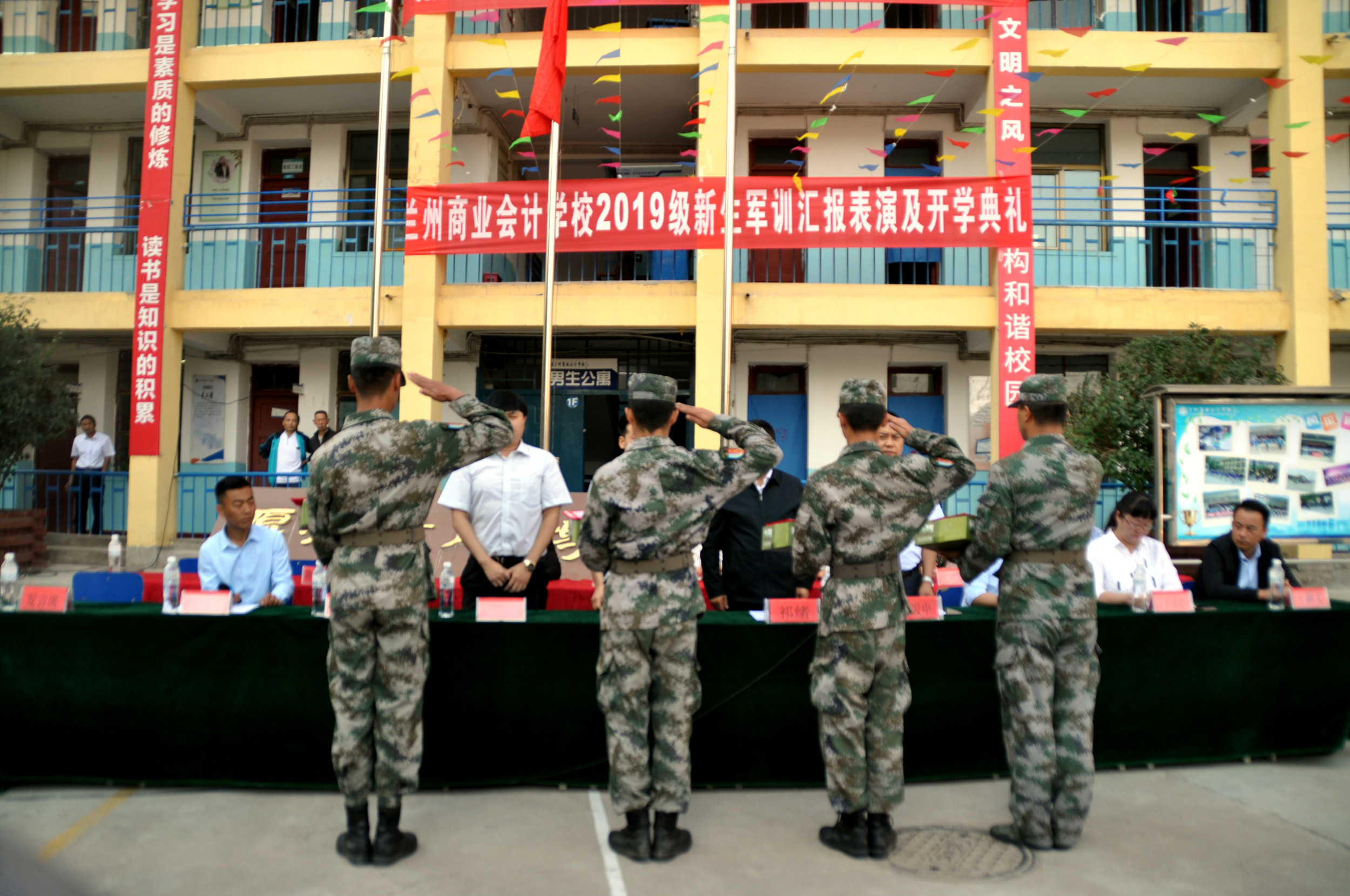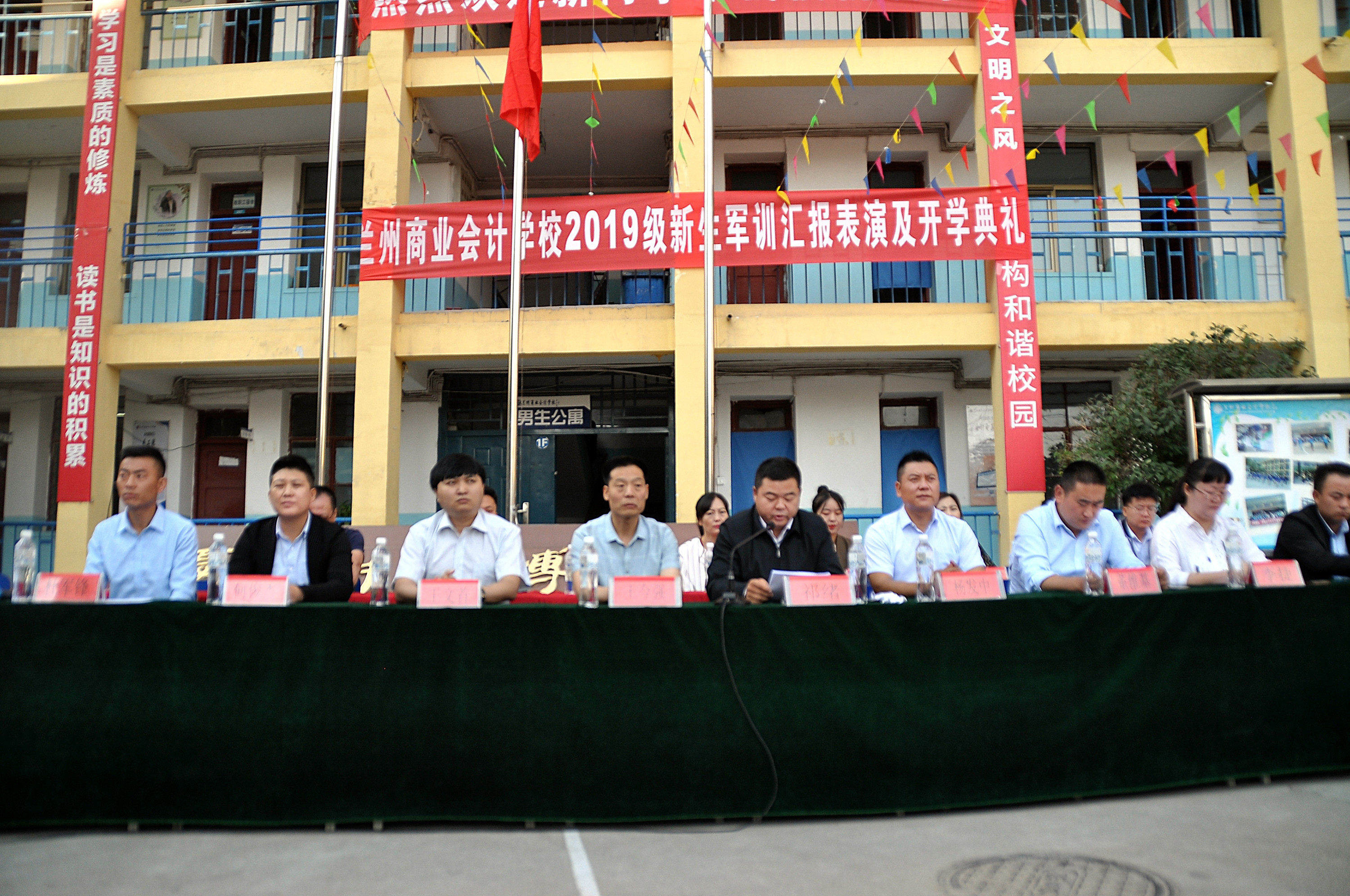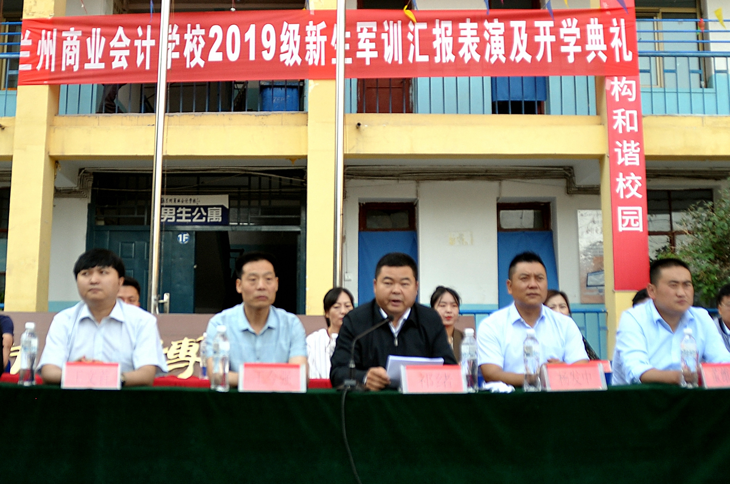 9月2日上午,兰州商业会计学校2019级新生军训汇报表演暨开学典礼在五泉校区隆重举行,学校校长祁绪、书记王今强、副校长杨发中、副校长王文首、学工部主任何俊杰、综合办主任李琪、学生科科长董维基、教务科李捷老师、以及双城门、西固、东部等几个教学部主任及部分班主任出席了此次典礼,军训教官带领我校2019级全体新生参加了典礼,典礼由校团委书记杜军锋老师主持。