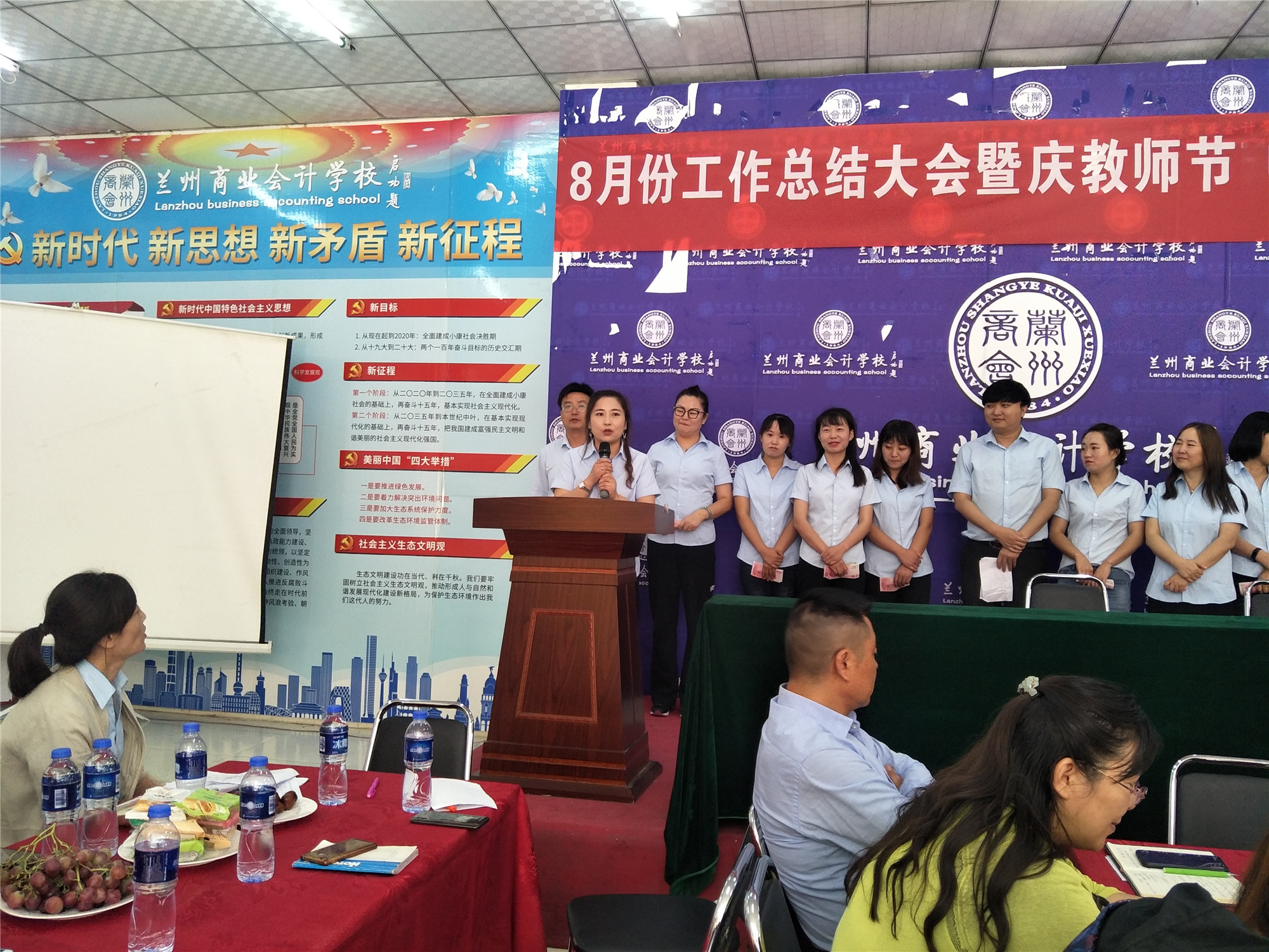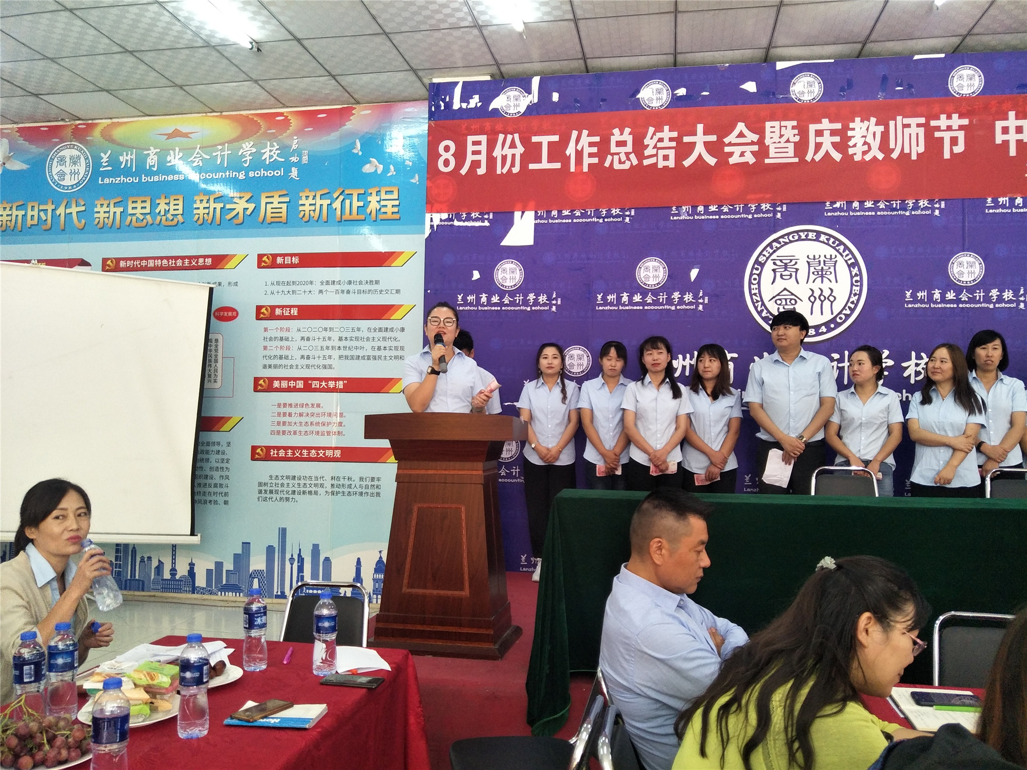 一年年春华秋实,一载载桃李芬芳,九月因赋予了教师职业的敬重而更加丰盈。在秋韵荡漾的日子里,兰州商业会计学校迎来第35个教师节,值此之际,为加强教师团队的合作与交流,使全体教职工度过一个愉快的节日,兰州商业会计学校于2019年9月10日在五泉校区多功能厅召开了8月份工作总结大会暨庆教师节、中秋节活动。学校校长祁绪、副校长杨发中、副校长赵雪琴、副校长王文首、兰商人力资源有限公司王经理、各培训分部主任以及全体在校员工出席了此次会议,会议由综合办公室主任李琪主持召开。