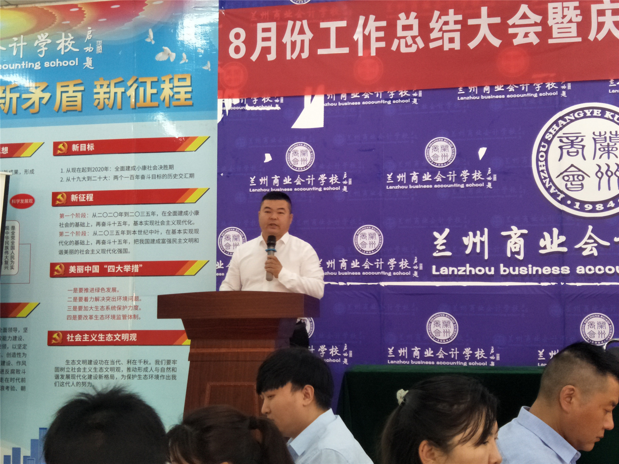 学校校长祁绪在活动上作了总结性发言,对参会的全体教职员工表达了节日的祝福。祁校长回顾了8月份学校的各项工作,提出了下一步工作的方向。祁校长希望全体教职员工,要顺应形势、加强学习、不断磨练,提升个人业务能力;要抱团取暖,依靠平台发展,充分发挥团队精神,提高团队凝聚力,与兰商共同发展;要规范自我, 注重个人品质修养的培养。祁校长勉励全体员工要感恩学校、感恩社会、积极工作、快乐生活。最后,祁校长为全体教职员工送上了节日的问候和祝福。