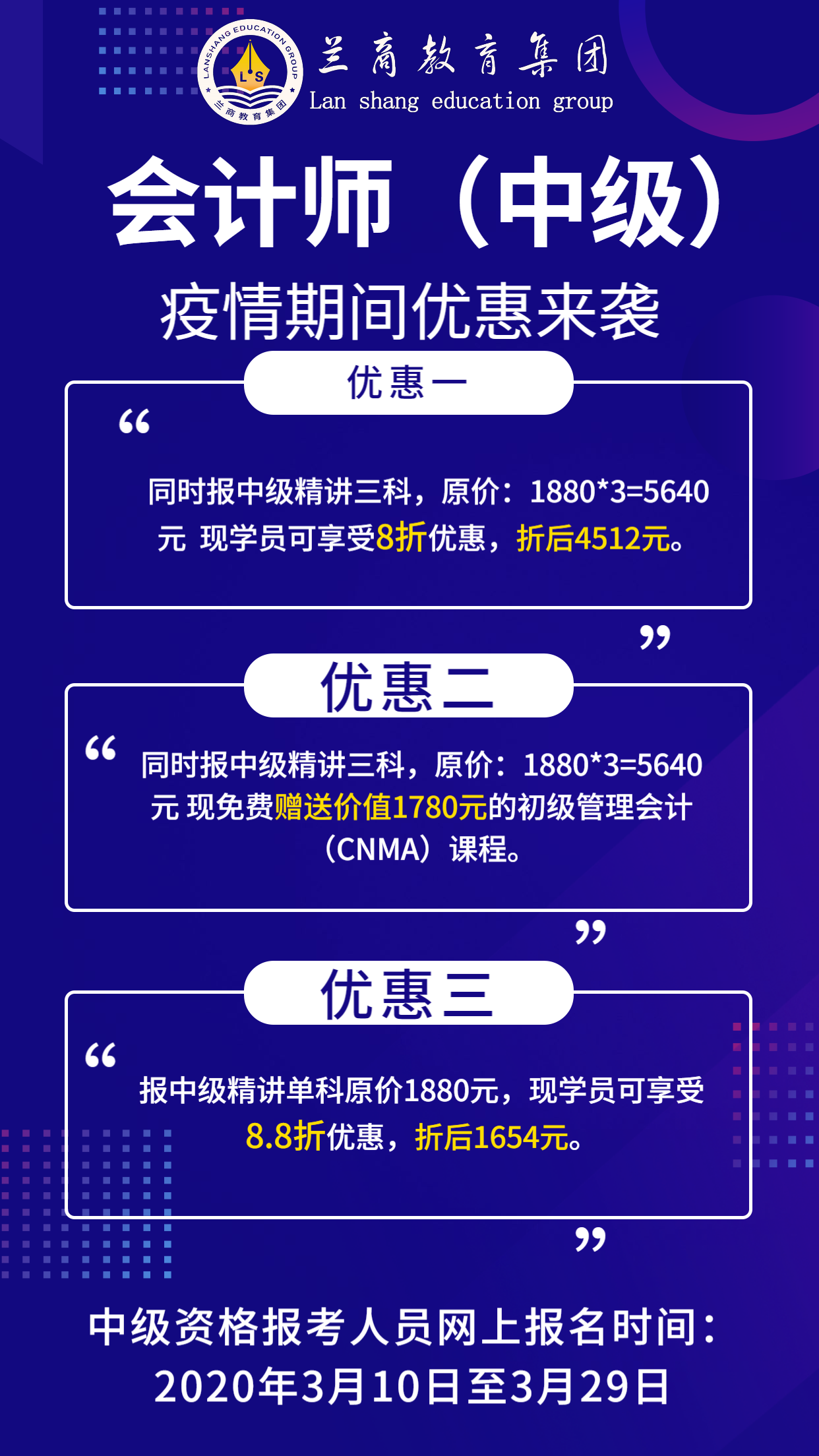 (一)中级资格报考人员网上报名时间:2020年3月10日至3月29日。