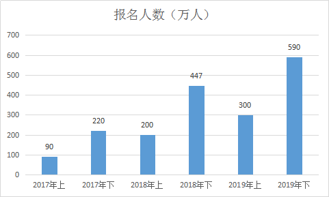 从上面这组数据来看,无论是上半年还是下半年,报名人数都在激增。在2019年下半年更是达到了顶峰,全国超过590万人报考。据教育新闻网报道,2019年下半年教资考试由28省参加全国统考,考生人数超过590万人,创历史新高,通过率已经由原来的27.5%下降为现在的17.4% ,下降了整整10个百分点!考教师证是一直以来的热度,每年报考人数都呈“喷井式”增长,今后一段时间都会持续着......铁饭碗才是王道