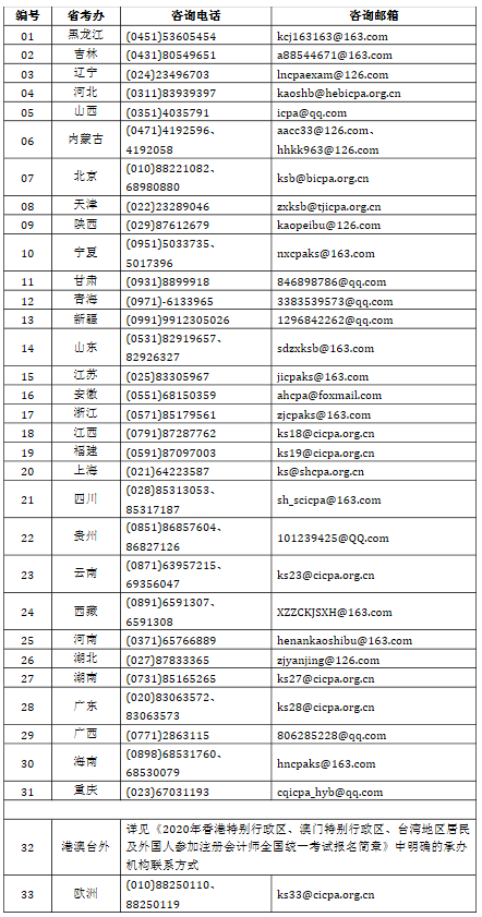 为方便考试报名人员咨询,现将各省考办及港澳台外、欧洲考区联系方式公布如下: