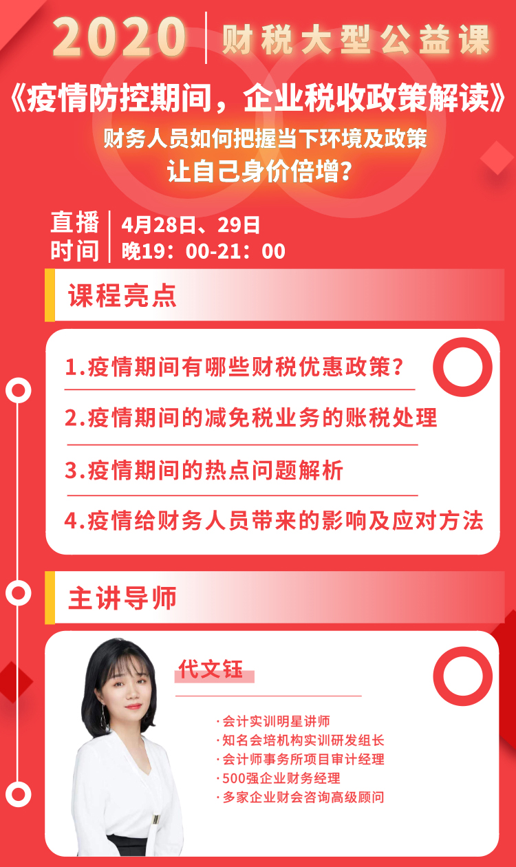 本次线上讲座,在新冠肺炎疫情困难条件下,财务会计如何充分利用国家的优惠政策,减轻企业成本、税收压力,对相关的税收优惠政策解读,同时也是把握当下时机,提升自身价值的讲座,一次讲座将使你终生受益。