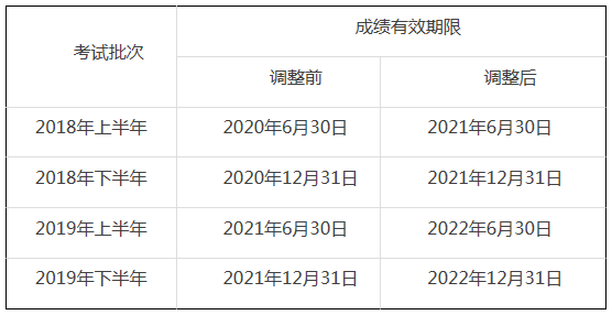 参加“2018年上半年至2019年下半年”各批次笔试,已通过的单科笔试科目成绩有效期延长1年,即成绩有效期由2年延长至3年,成绩查询网站页面会及时更新有效期限。参加“2017年下半年批次(含)之前”单科笔试科目成绩有效期已于2019年12月31日前终止,因此不再延长。(延长批次详见下表)