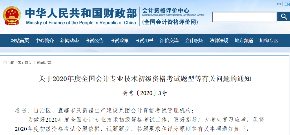 关于2020年度全国会计专业技术初级资格考试题型等有关问题的通知