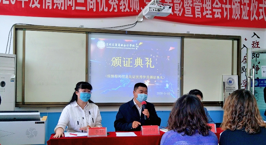 在疫情持续向好,兰商教育顺利复课之际,为了表达对疫情期间在教学、教务上兢兢业业的老师和在学习上表现勤奋、优秀的学员的鼓励和祝贺,兰州商业会计学校于2020年5月10日在兰商双城门分校隆重举办“2020年疫情期间兰商优秀教师、学员表彰暨管理会计颁证仪式”。兰商教育集团董事长、兰州商业会计学校校长祁绪、副校长赵雪琴、办公室主任李琪、学历部主任何俊杰等领导及兰商疫情期间表现优秀的学员和顺利获取管理会计证书、会计信息化证书的学员们参加了此次活动,活动由兰商教务部主任李捷主持。