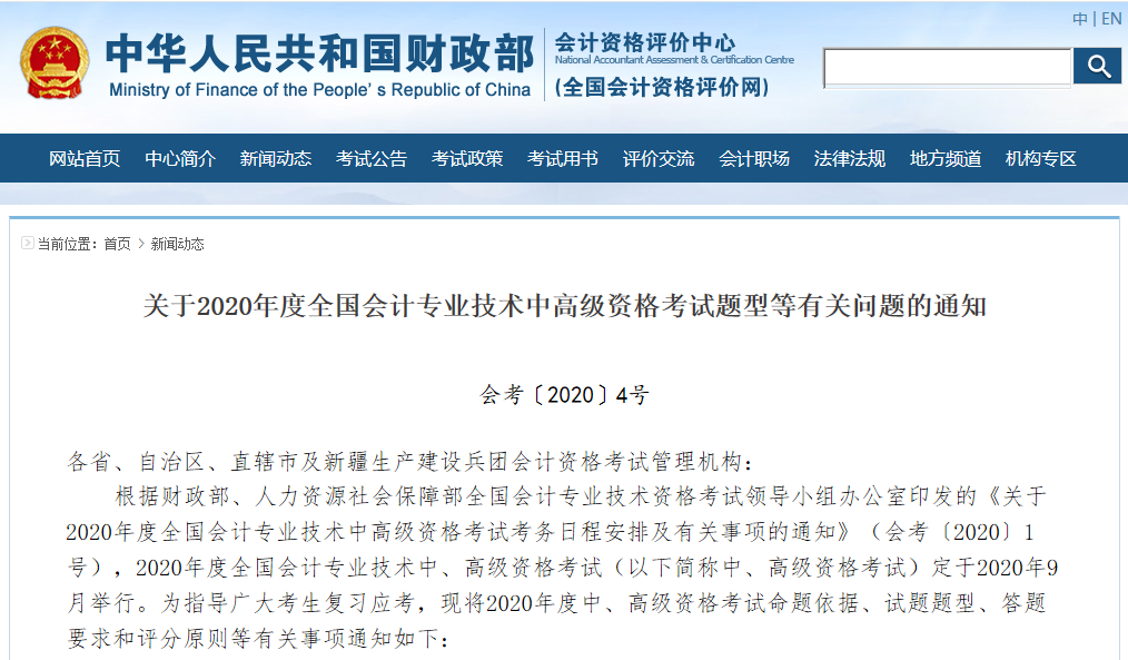 关于2020年度全国会计专业技术中高级资格考试题型等有关问题的通知