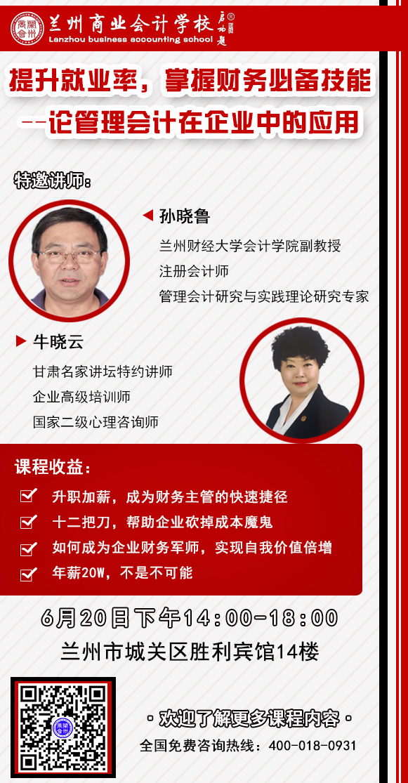 6月20日,兰州商业会计学校将举办《提升就业率,掌握财务必备技能--论管理会计在企业中的应用》大型公益讲座,谨此,兰州商业会计学校诚邀您拨冗出席,相信您一定不虚此行。
