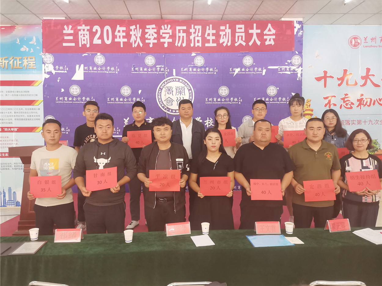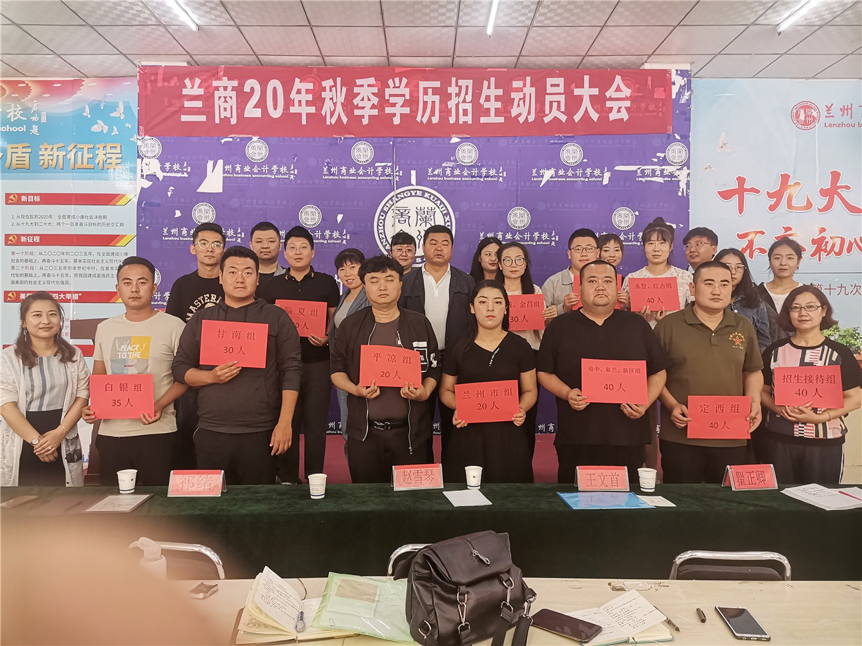 为了保证2020年秋季招生工作的圆满完成,兰州商业会计学校五泉学历校区何主任宣读了各招生组招生任务,校长祁绪为各招生组颁发了招生任务书。招生工作是学校工作中的重中之重,是保证学校可持续发展的重要环节。全校教职工要时刻增强做好招生工作的责任感和紧迫感,攻坚克难,努力完成招生任务。