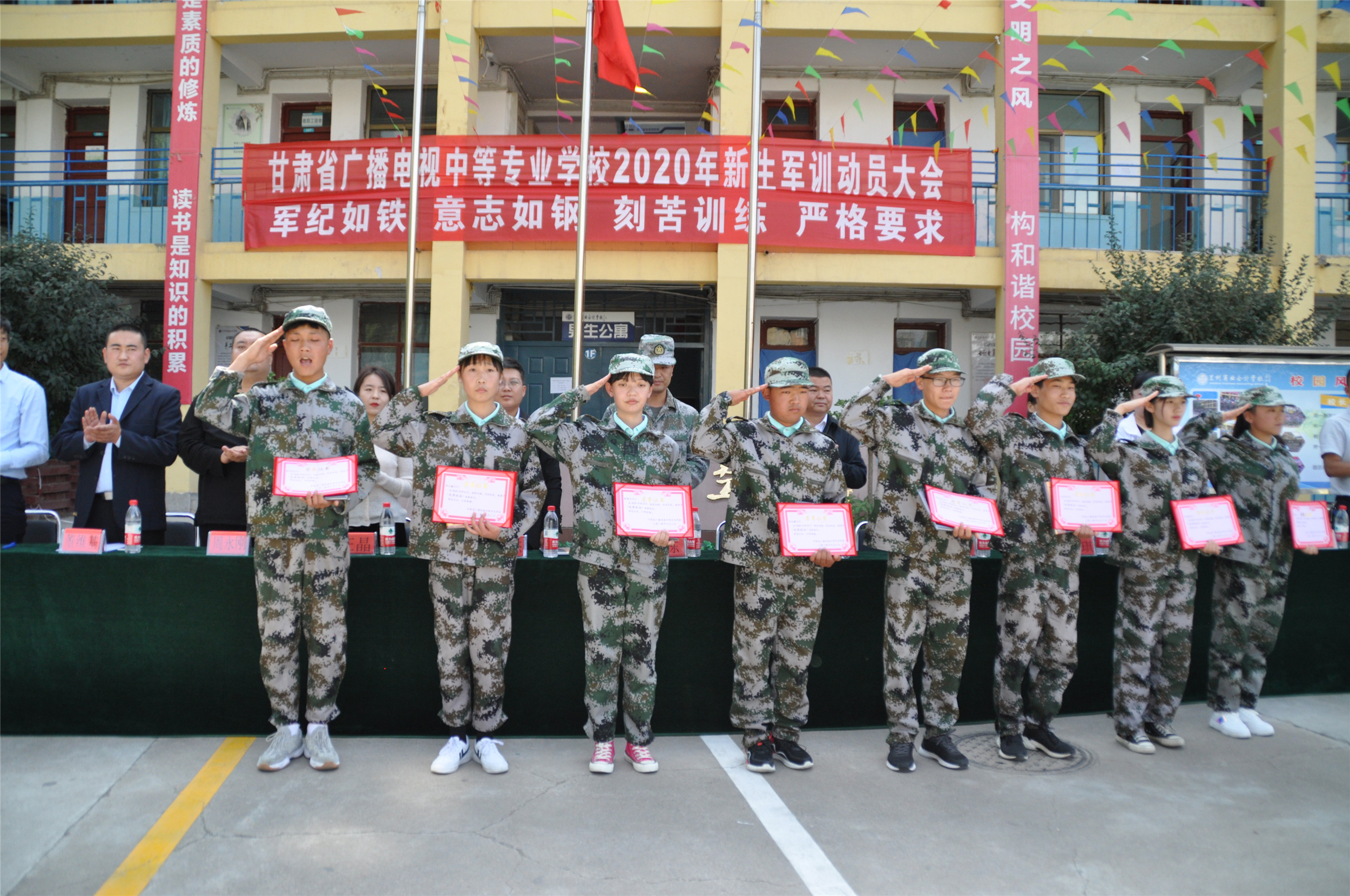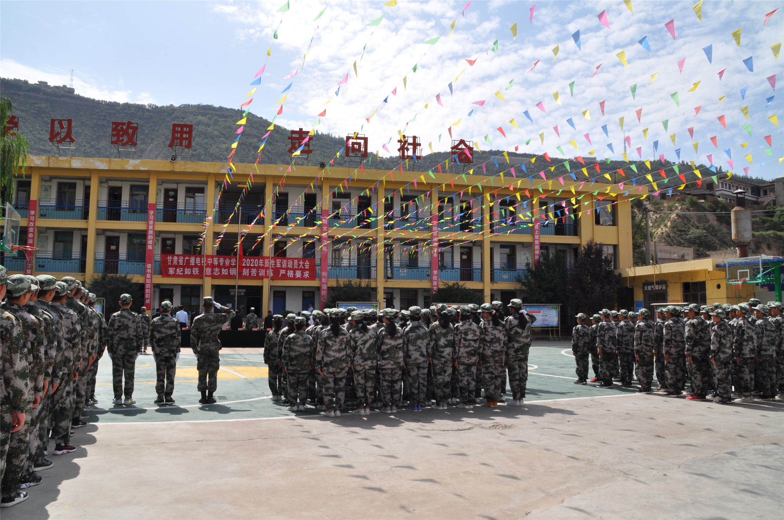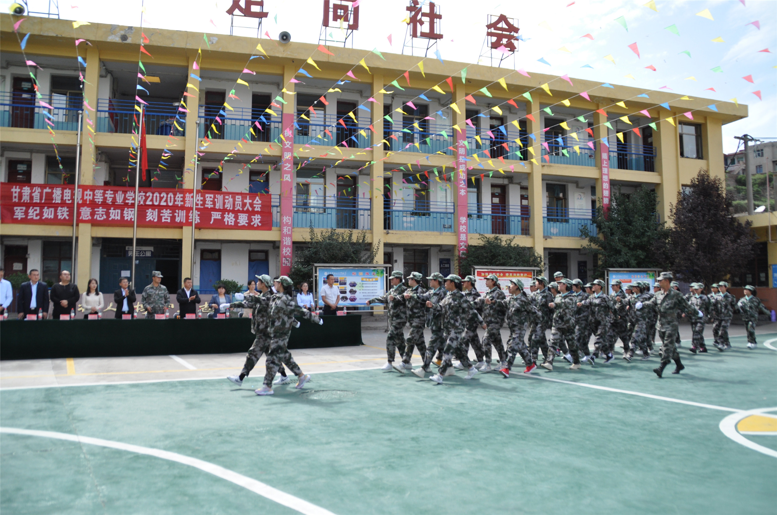2020年9月6日,甘肃省广播电视中等专业学校(兰商校区)2020级新生军训汇报表演暨开学典礼在校园篮球场上隆重举行,兰商校区校长祁绪、承训单位领导蔡春东同志、副校长赵雪琴、综合办主任李琪、教务部主任李捷、校区主任何俊杰、学生科科长董维基、就业办主任周永刚等领导出席,各班班主任及学校全体在校学生参加了新生军训汇报表演暨开学典礼,典礼由校团委书记杜军锋老师主持。
