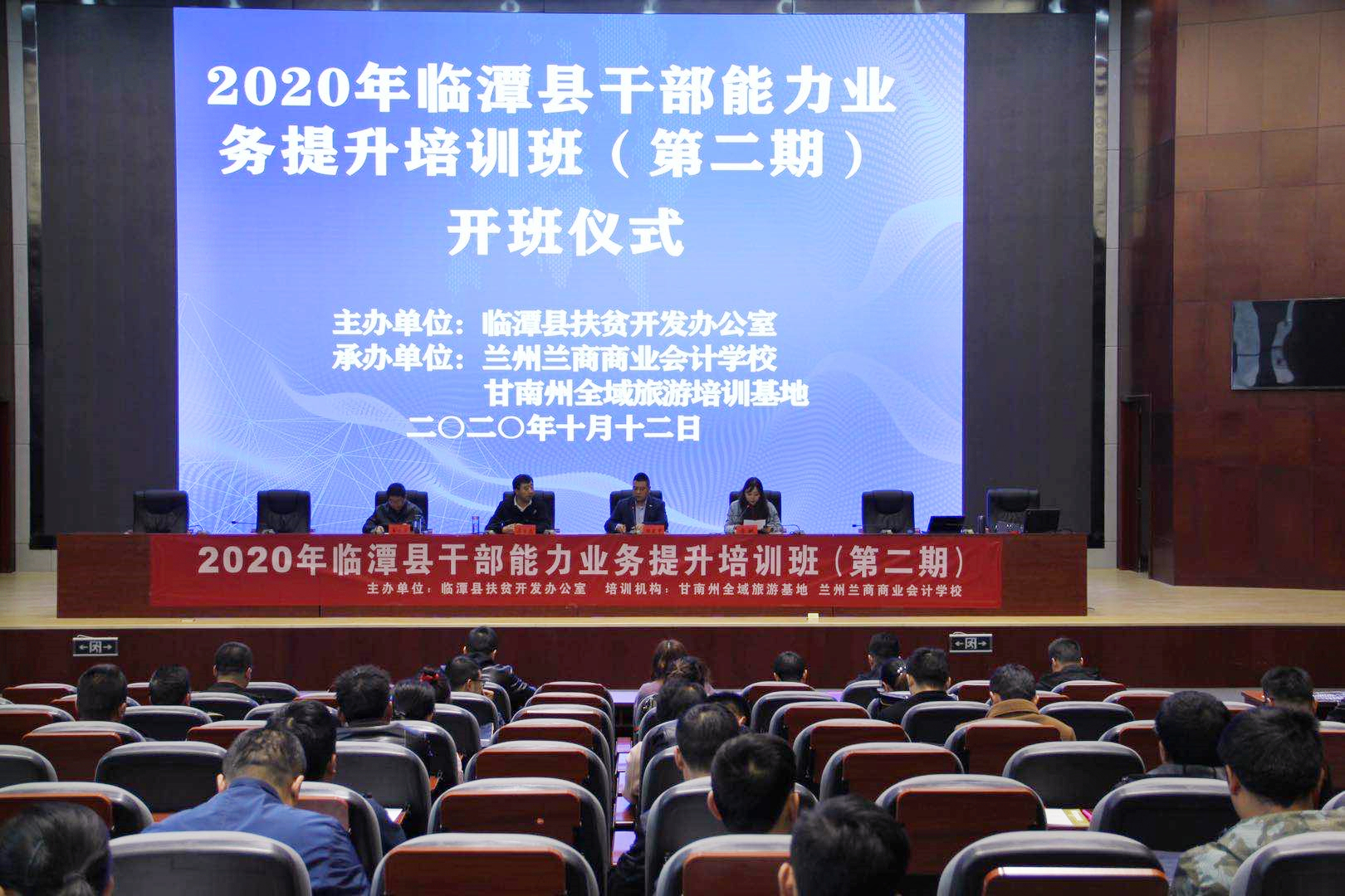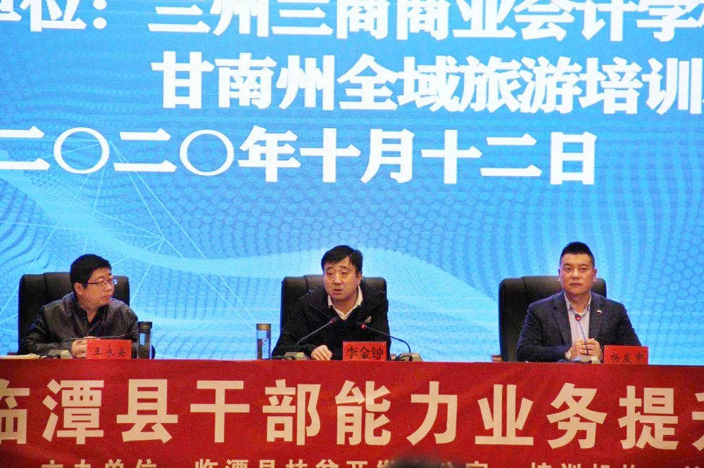 为进一步理清工作推进中遇到的新问题,提高党政干部政策理论水平,10月12日上午,由临潭县扶贫开发办公室主办,兰州兰商商业会计学校、 甘南州全域旅游培训基地承办的2020年临潭县干部能力业务提升培训班(第二期)在甘南州全域旅游培训基地顺利开班。临潭县扶贫开发办公室主任李金钟,甘南州文旅交建集团公司总会计师、甘南州全域旅游培训基地负责人王永安,兰州兰商商业会计学校副校长杨发中出席了开班仪式,全县党政干部共计90余人参加本期培训。