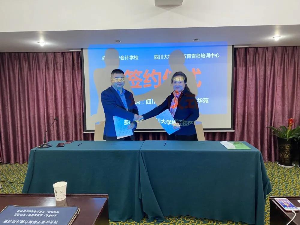 (兰州兰商商业会计学校校长祁绪与四川大学继续教育青岛培训中心主任王琍签订战略合作框架协议)