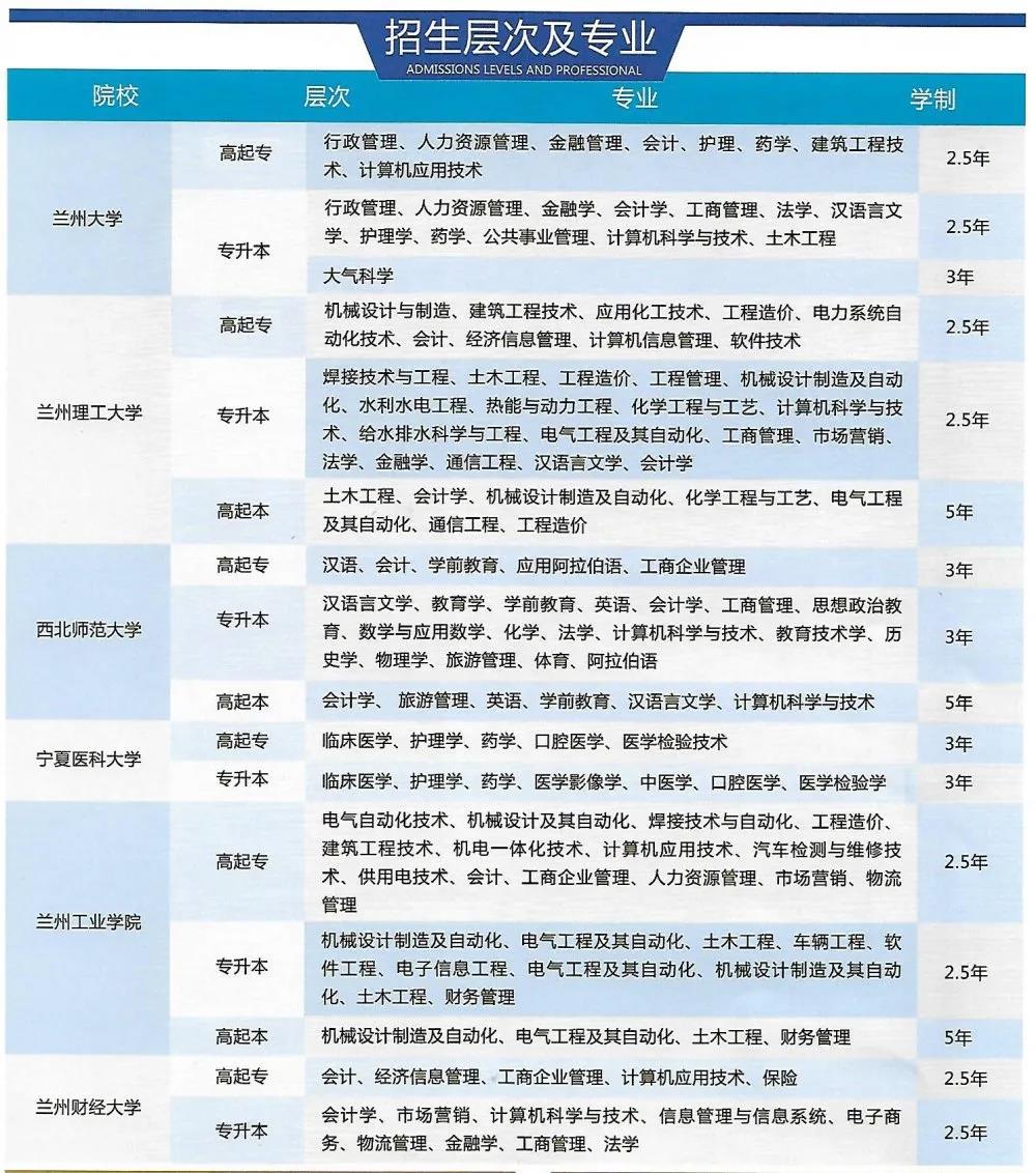 多年来我校结合学历教育与职业培训的工作,以“服务学校工作、服务培训教学、服务学员学习”为办学宗旨,本着求真务实,发展创新的态度,加强与各个重点本科院校的联系。整合各类资源,学校先后与兰州大学、兰州理工大学、西北师范大学、宁夏医科大学、兰州工业大学、兰州财经大学、甘肃广播电视大学等建立了良好的合作关系。