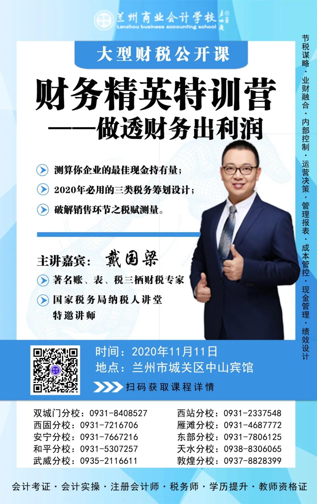 11月11日前报班可享受特大优惠、抽现金奖等多重惊喜。还有著名账、表、税三栖财务专家戴国梁老师2020年最热门的课程《财务精英特训营——做透财务出利润》,专为财会职场道路前行中的财务、会计、管理层量身定制,真正实用的财务课程。现场咨询、方案、答疑、案例相结合,让财会人从此不再为财税问题而烦恼!
