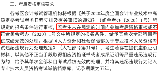 若考生未在规定的时间内参加考后资格审核或不符合闽会考办〔2020〕1号文中所规定的报名条件,给予其单次全部科目考试成绩无效的处理。