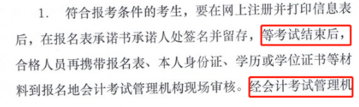考后资格审核。符合报考条件的考生,要在网上注册并打印信息表后,在报名表承诺书承诺人处签名并留存,等考试结束后,合格人员再携带报名表、本人身份证、学历或学位证书等材料到报名地会计考试管理机构现场审核。经会计考试管理机构审核通过后,领取证书,凡不符合报名条件的考生考试成绩无效。