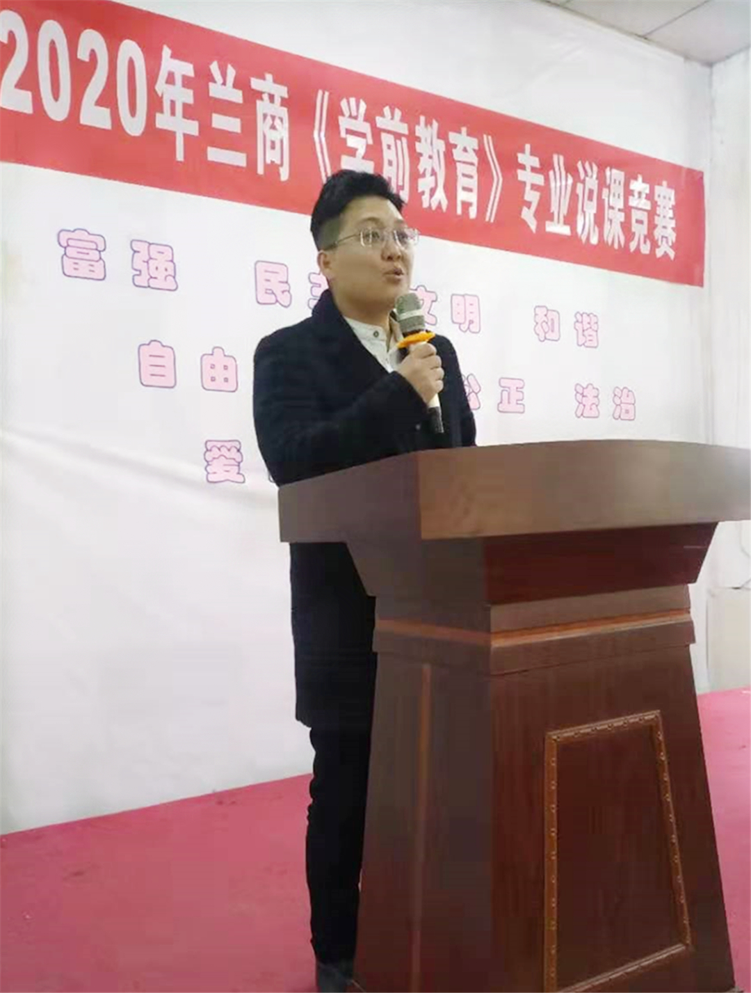 兰商专业指导老师陈伟强老师宣读了本次大赛的评分标准和要求,希望学生们严格遵守赛场纪律,认真竞赛,充分展示兰商学前教育专业学子扎实的教学基本功和闪亮的风采。