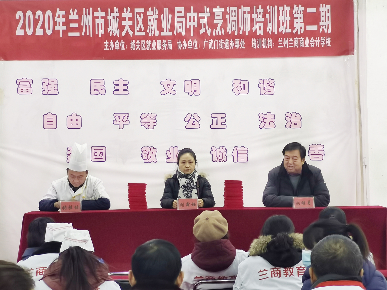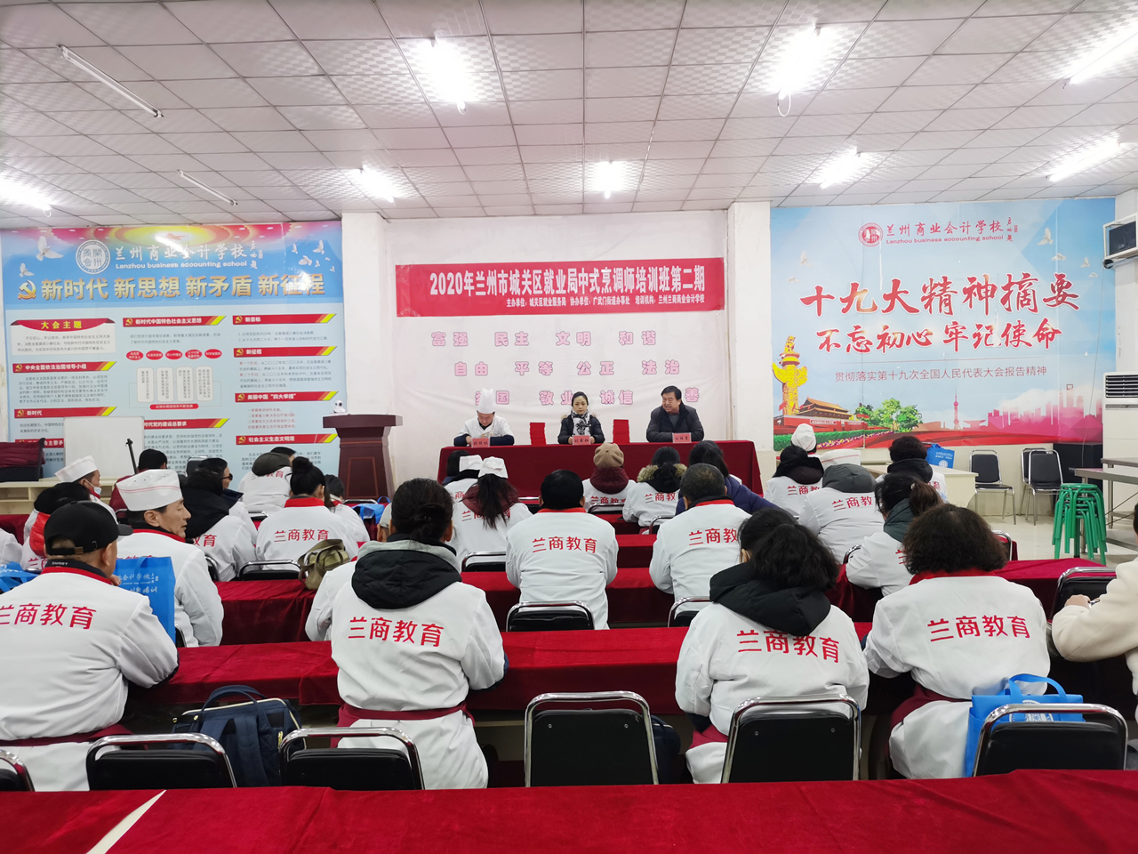 12月19日下午,由兰州市城关区就业局主办,广武门街道办事处协办,兰州兰商商业会计学校承接的“2020年兰州市城关区广武门街道中式烹调师培训班(第二期)”结业典礼在兰州兰商商业会计学校五泉校区圆满举行,广武门街道劳保所主任刘鑫钰、兰州兰商商业会计学校精准扶贫培训中心主任刘继勇、授课教师张桂林及全体参训学员出席结业典礼。