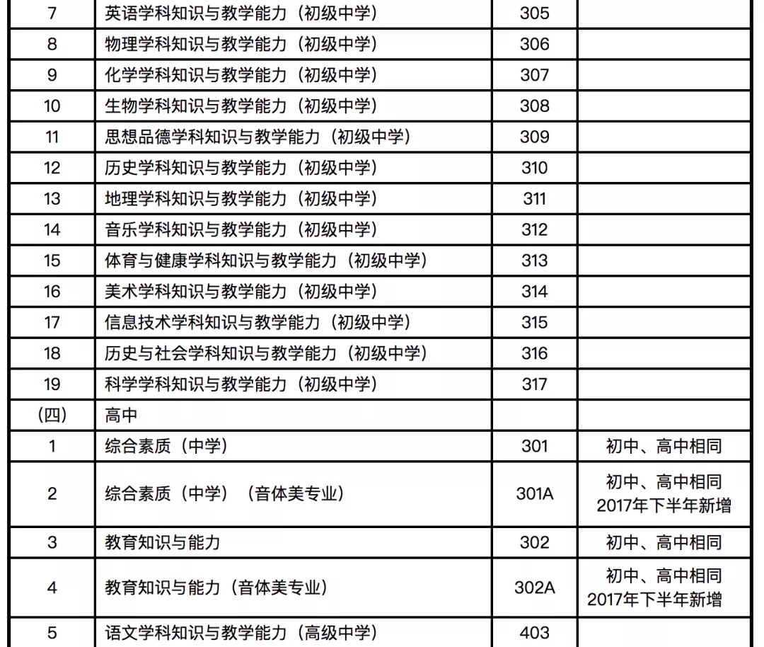 1.为完善中小学教师资格考试制度设置,加强中小学音、体、美专业教师队伍建设,从2017年下半年考试开始,对音、体、美专业考生的笔试公共科目一、科目二(科目代码:201、202、301、302)实行单独编码(相应科目代码:201A、202A、301A、302A),考试内容暂与原科目相同。实行单独编码后,音、体、美专业考生在笔试报名时应选报单独编码的公共科目。取得科目201A、202A合格的考生,面试仅限于参加小学类别音、体、美专业科目;取得科目301A、302A合格的考生,面试仅限于参加初中、高中、中职文化课音、体、美专业科目。考生已获得科目201、202、301、302合格成绩,可相应替代科目201A、202A、301A、302A合格成绩;考生已获得科目201A、202A、301A、302A合格成绩不可替代科目201、202、301、302合格成绩。
