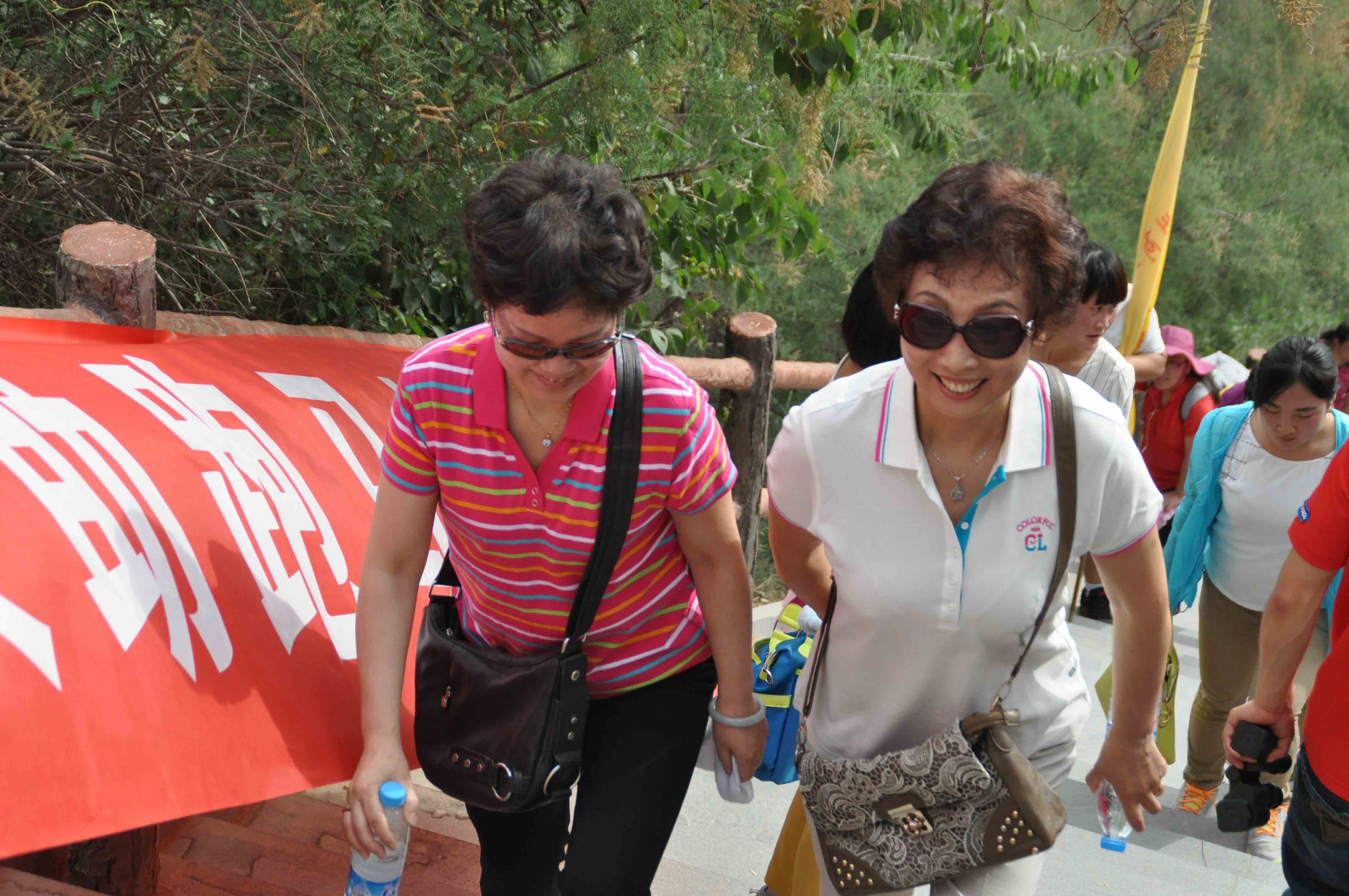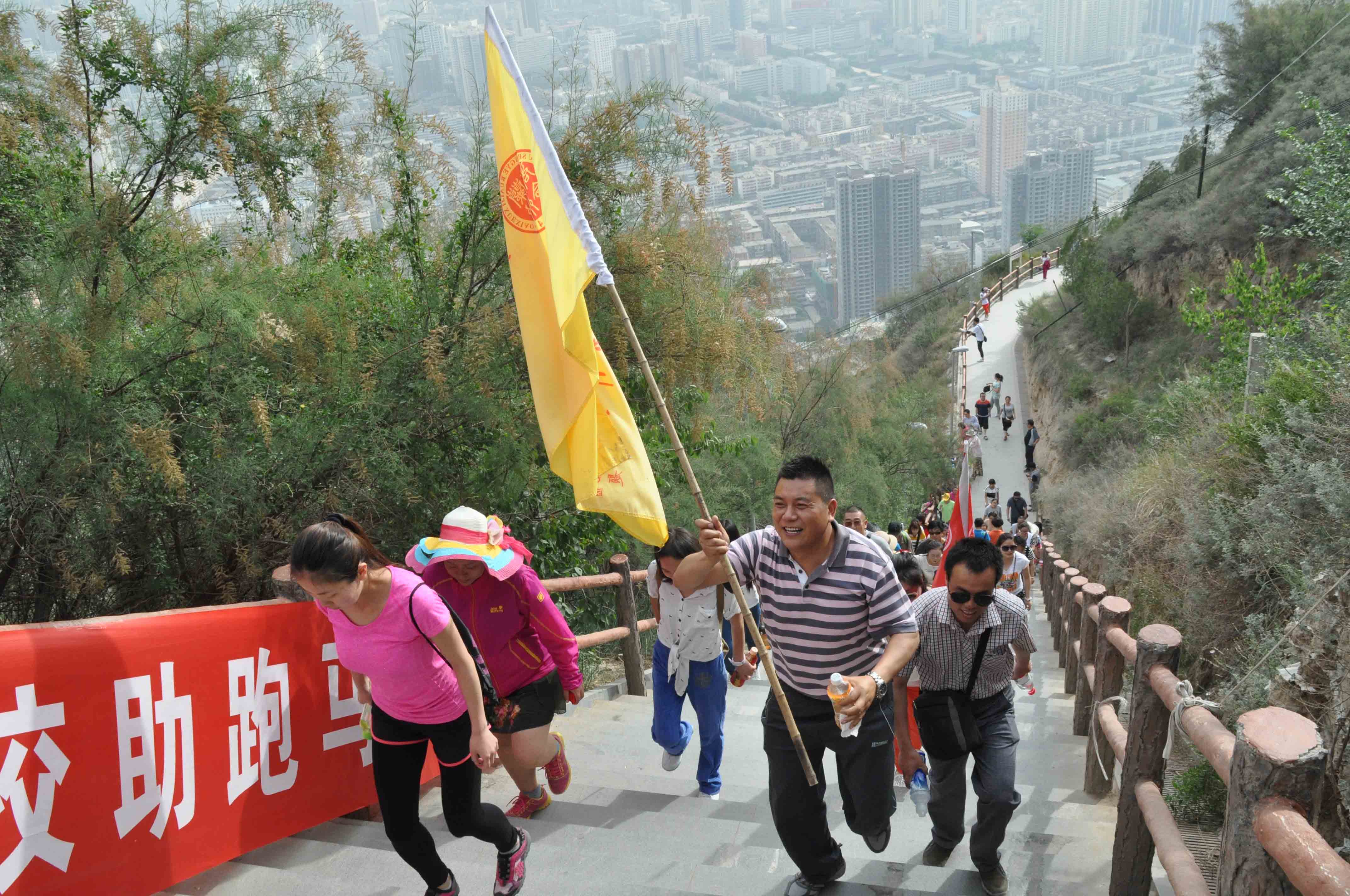学校全体教师在五泉校区集合,分组向兰山进发,校旗在风中照耀,老师们精神抖擞、笑靥如花、相扶相携,向着终点挺进。