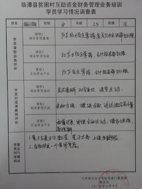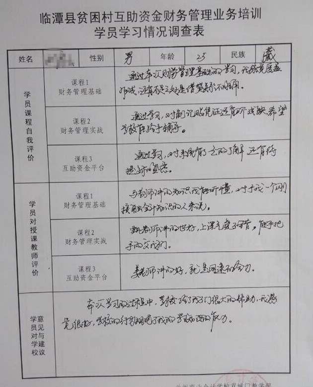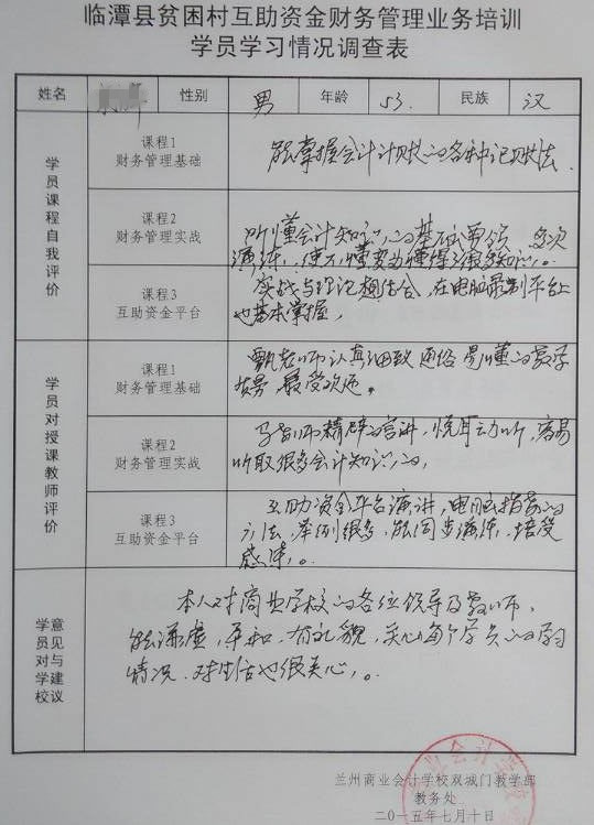 经过为期五天的集中培训,2015年甘南州临潭县互助资金财务管理培训圆满结束,结束后,参训人员认真填写了“临潭县贫困村互助资金财务管理业务培训学员学习情况调查表”,调查表不仅明确反映出参训人员的知识水平和培训效果,同时参训人员也给学校提出了宝贵的意见和建议。小编在此更大家分享一下他们的培训收获: