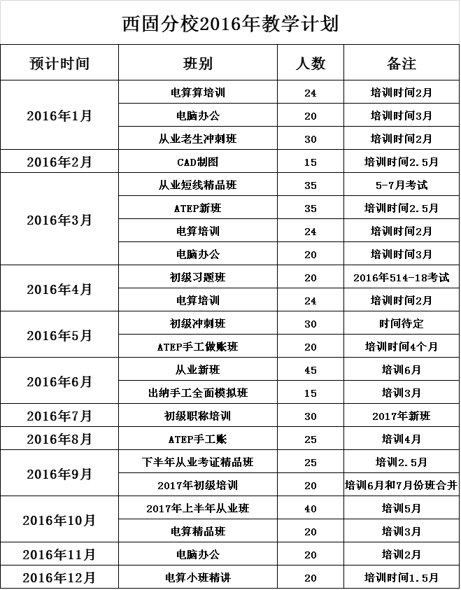 西站分校2016年全年基本开班计划