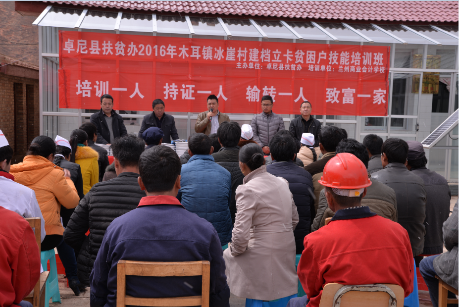 2016年3月24日下午,兰州商业会计学校以“大篷车、进村培训、送教上门”的培训方式,在卓尼县木耳镇冰崖村委会举办第二期建档立卡贫困户劳务技能培训开班仪式! 参加开班仪式的领导有:木耳镇人民政府综合治理办公室主任、冰崖村包村领导丁海云,兰州商业会计学校副校长杨发中,村委会主任李五十九等相关负责人一并参会,助力贫困家庭脱贫致富。