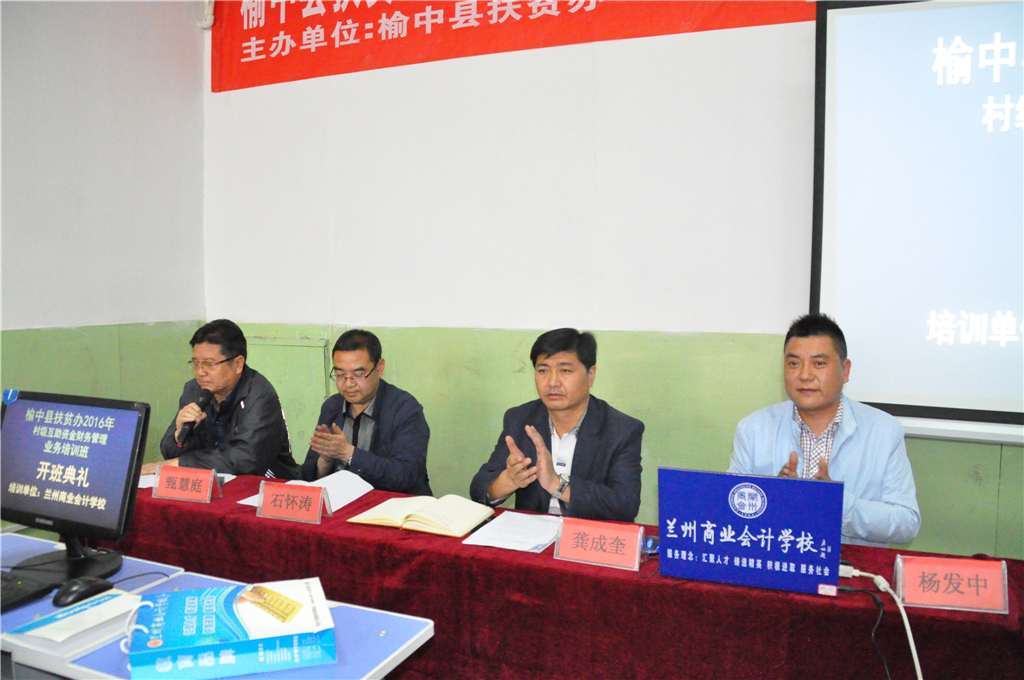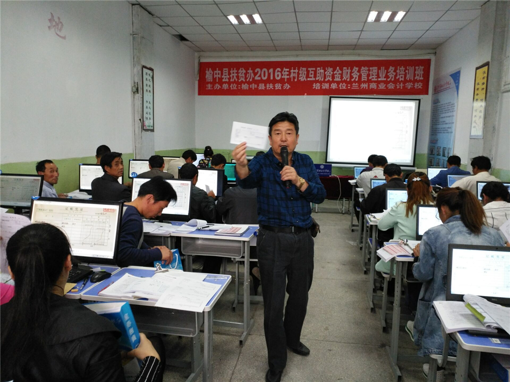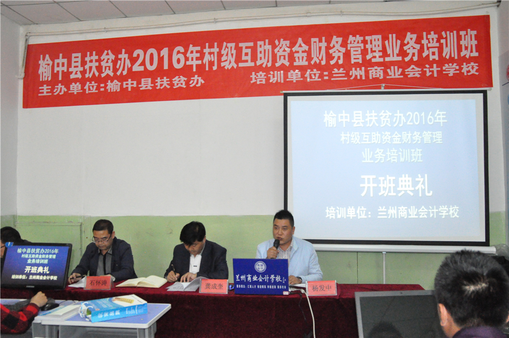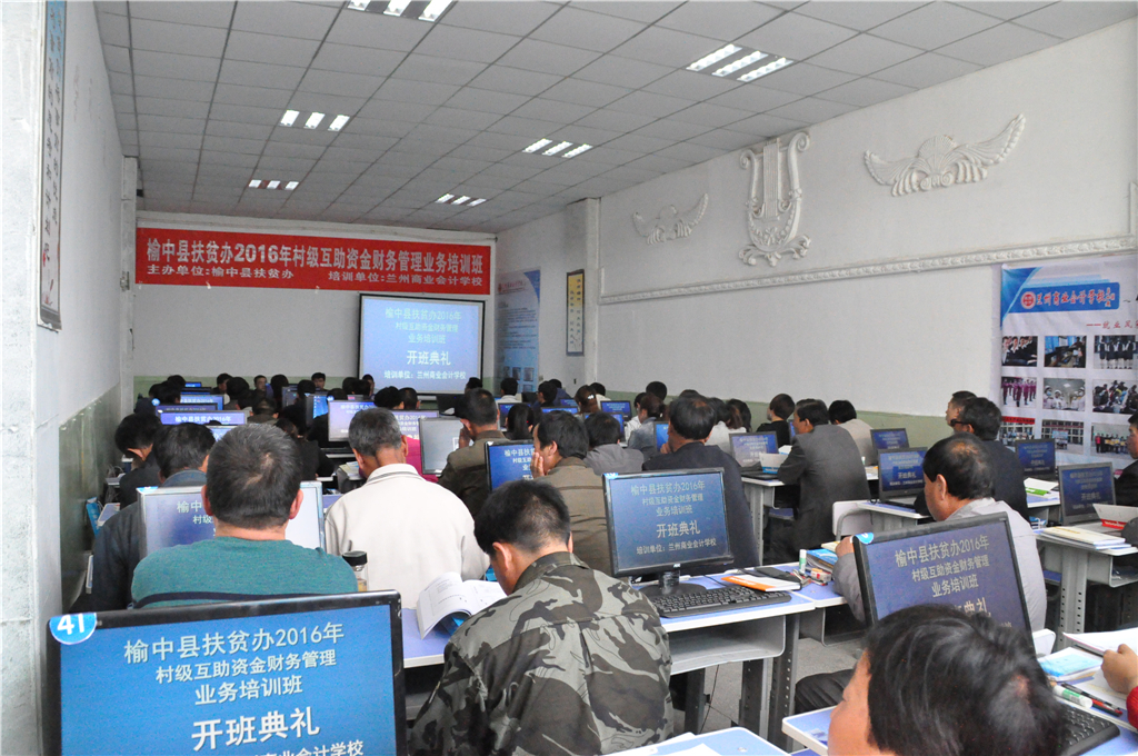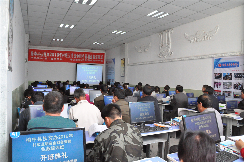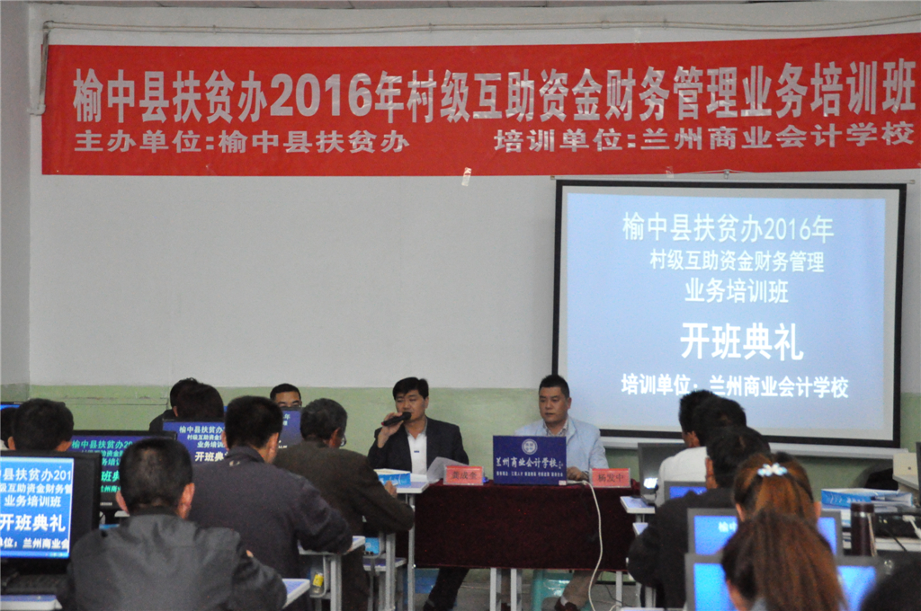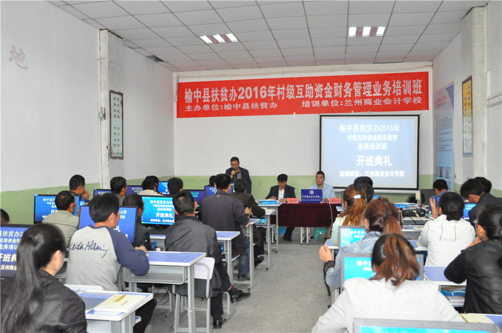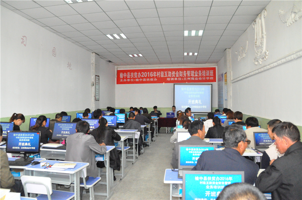 榆中县村级互助资金项目的200个村,每村财务骨干各一名,总培训人数200人,培训班共举办三期,榆中县扶贫办委托兰州商业会计学校于2016年5月13日在兰州商业会计学校多媒体教室举办第一期开班。