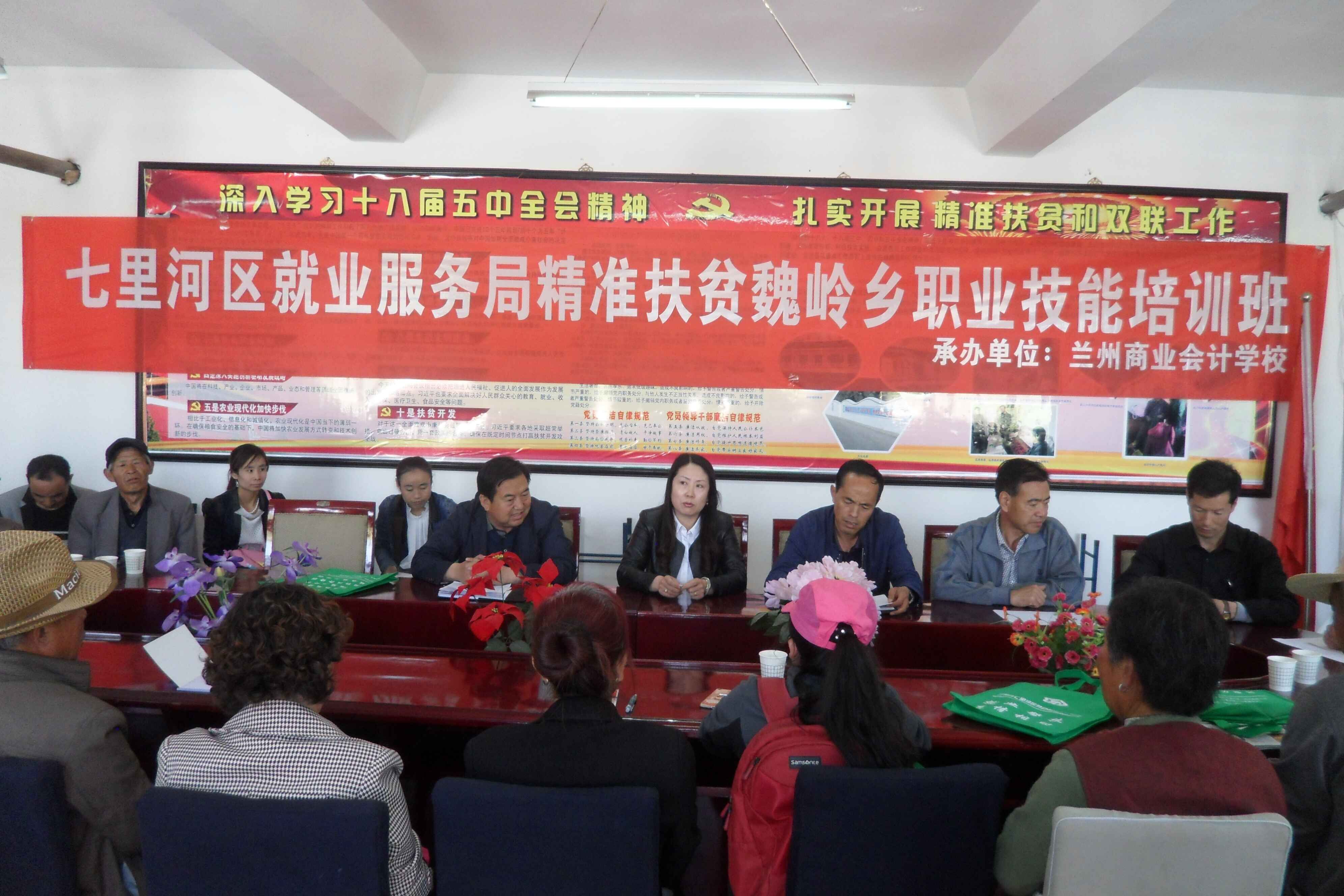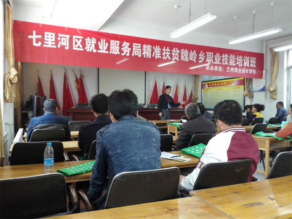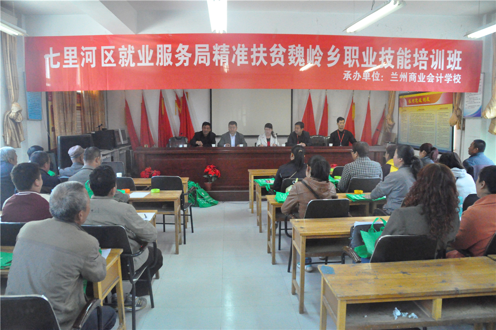 兰州市七里河区就业局委托兰州商业会计学校举办“精准扶贫职业技能培训班”,培训对象为兰州市七里河区魏岭乡八个行政村的精准扶贫建档立卡贫困户,培训人数400多人。培训班于4月27日在兰州市七里河区魏岭乡小山口村举行开班仪式。此次培训是为了达到“培训一人、持证一人、输转一人、致富一家”的目标,使贫困户在拿到技能培训证书的同时,切实掌握职业技能专业知识和实践能力,切实解决贫困户贫困问题。