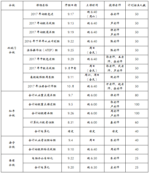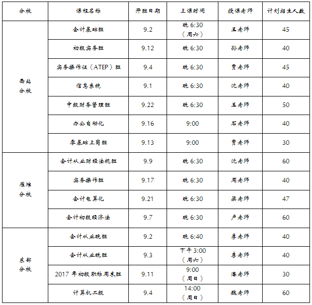 我校2016年9月份开班计划表