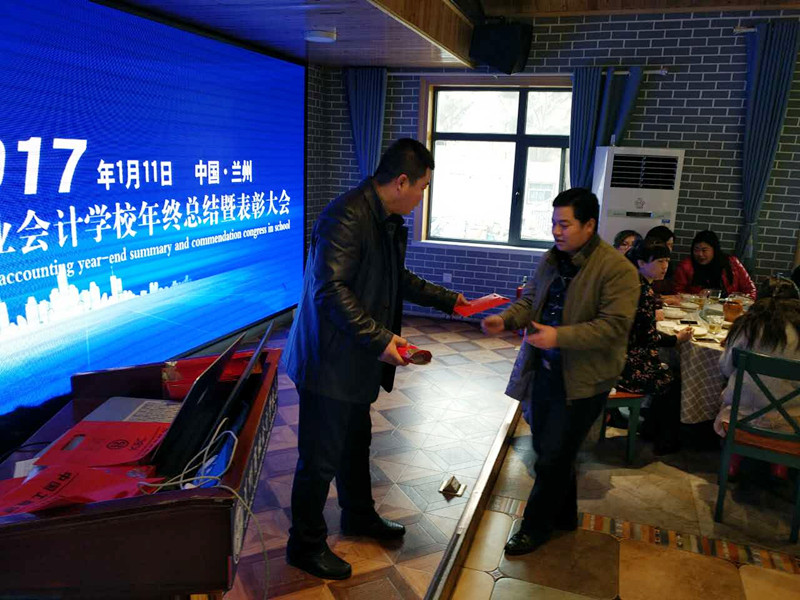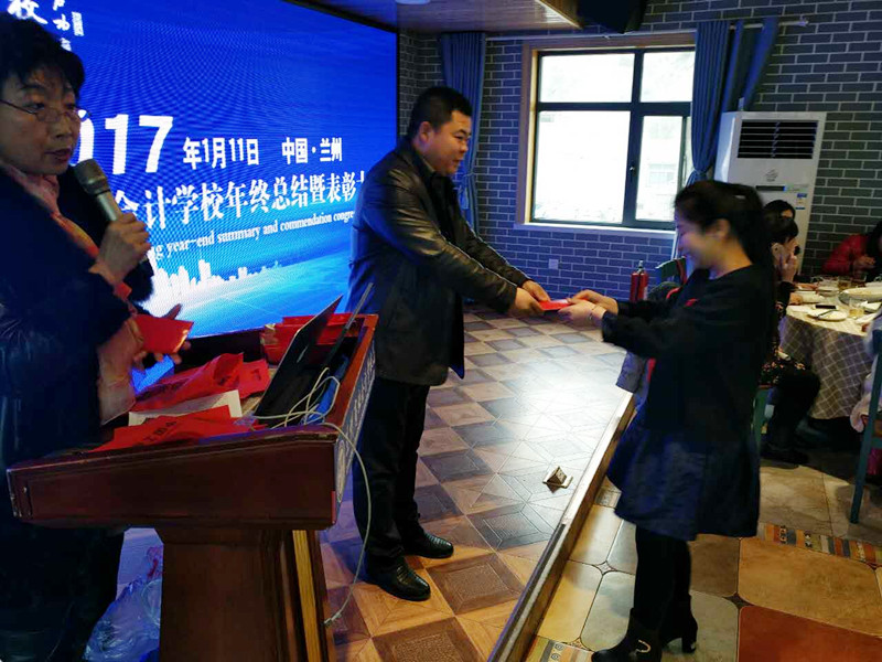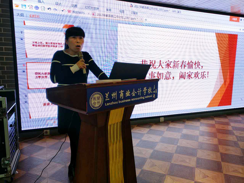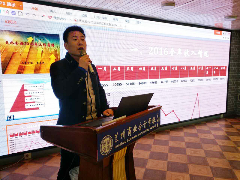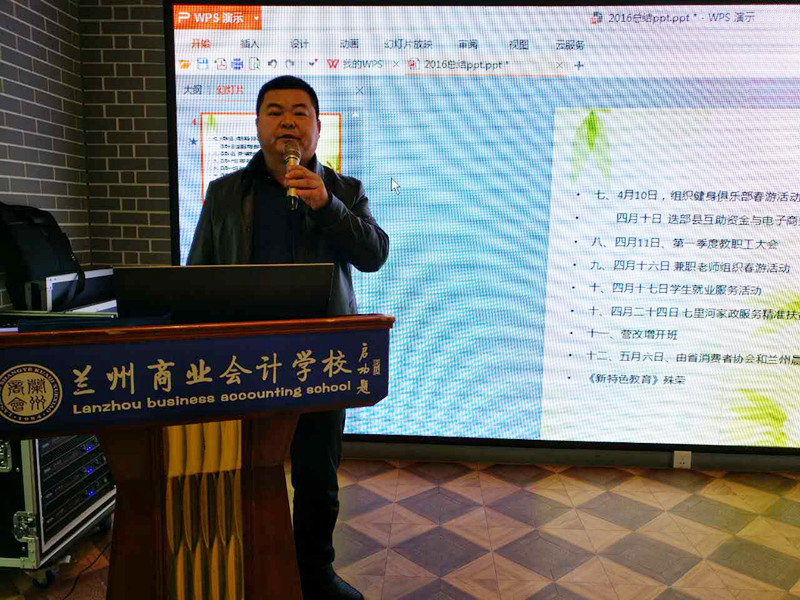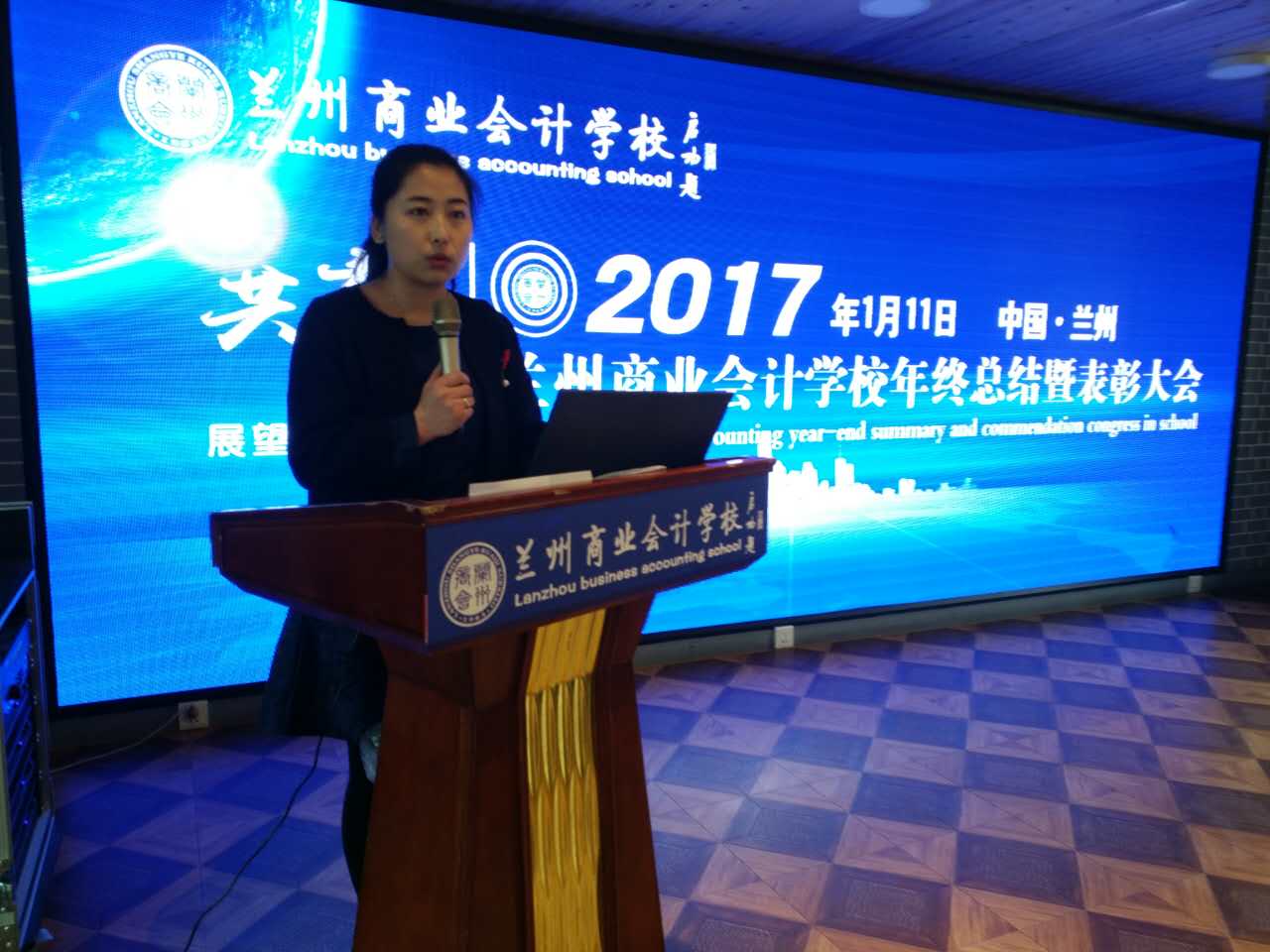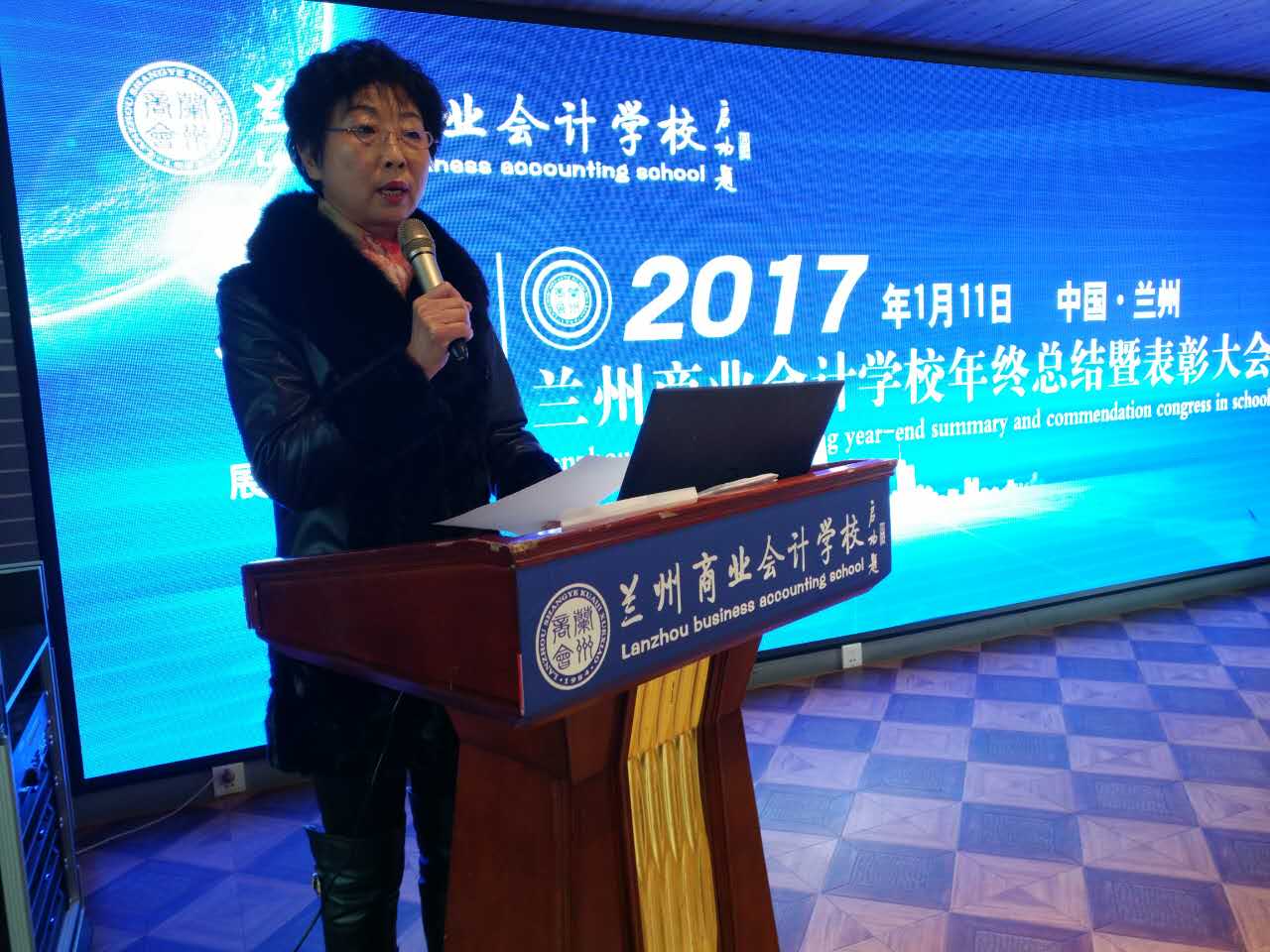 兰州商业会计学校年终总结暨表彰大会于1月11日上午隆重召开。校长祁绪、书记王今强、副校长杨发中、财务室会计杨娟平、白玉及各部门主任一起出席了大会,学校全体教职工共70余人参加了此次会议。学校今年进行了机构改革,新成立了销售部、总教务部、市场部,新部门主任也出席了此次总结会,本次会议主要就2016年工作进行回顾总结,并对2017年工作进行部署,会议由综合办主任李琪主持。