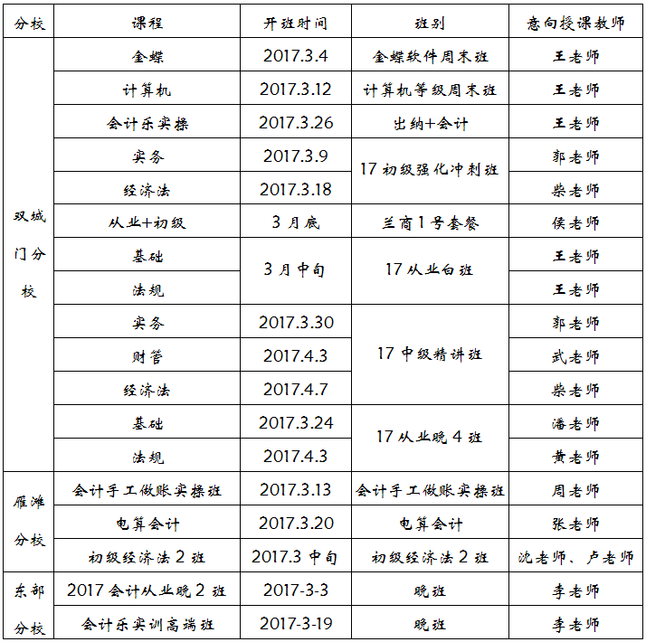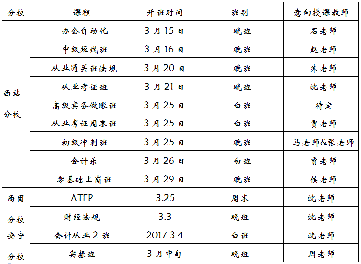 兰州商业会计学校2017年3月份开班计划表