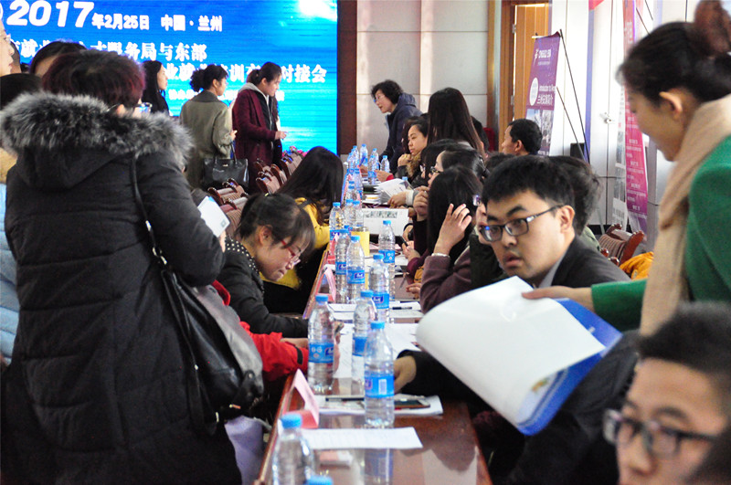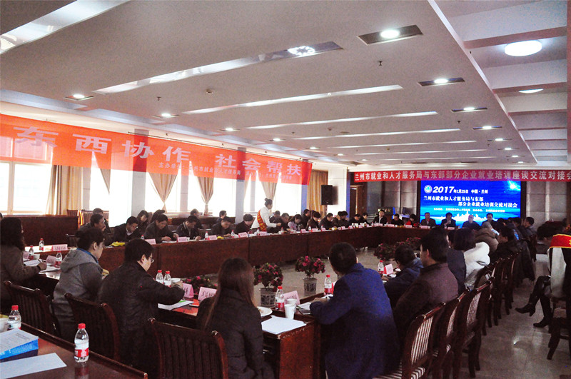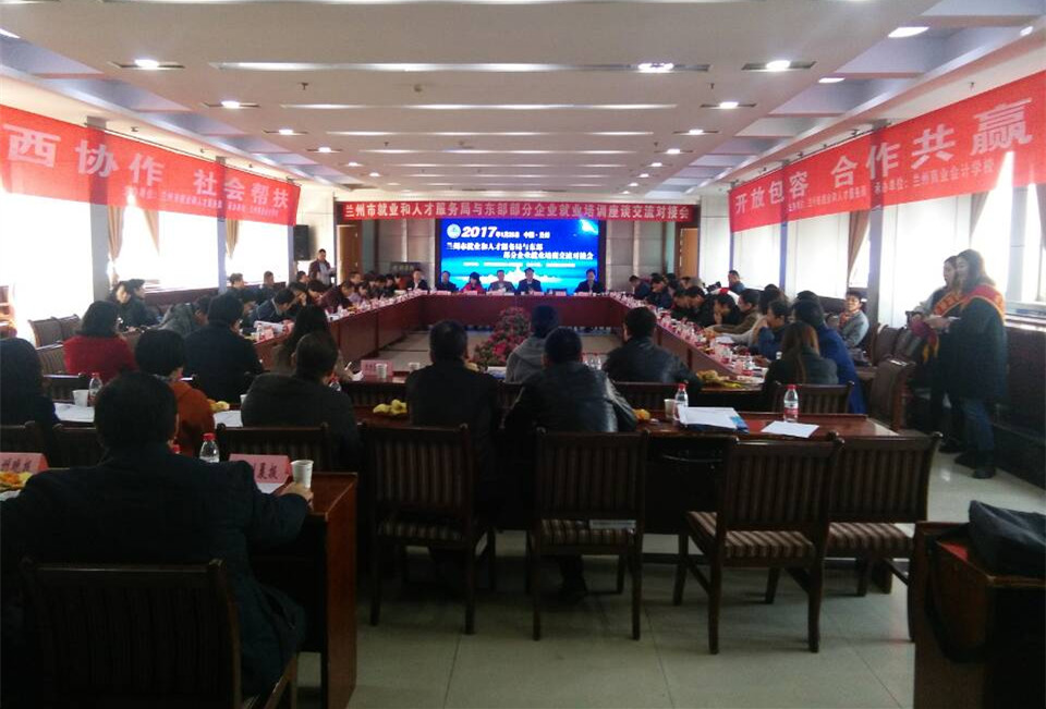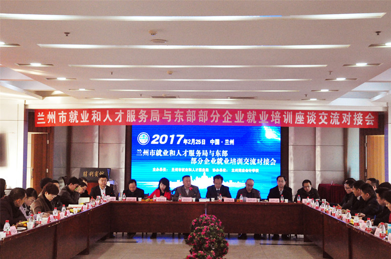 2017年2月25日,兰州市就业和人才服务局与东部部分企业培训就业交流对接会在兰州市城关区胜利宾馆盛大举办,会议由兰州市就业和人才服务局组织,兰州商业会计学校承办,甘肃省人社厅、省就业局、省劳务办、兰州市就业局及兰州市各县区就业局、劳务办、兰州市经济技术开发区组织人事局、招商局、甘南州人社局、劳务办、甘南州扶贫办及甘南州各县区扶贫办、阜宁县人社局、丹阳市人社局相关领导以及上海、阜宁、丹阳、镇江等地多家企业领导参加了此次交流对接会,会议由兰州市就业和人才服务局副局长王伟程同志主持。(交流对接会现场)