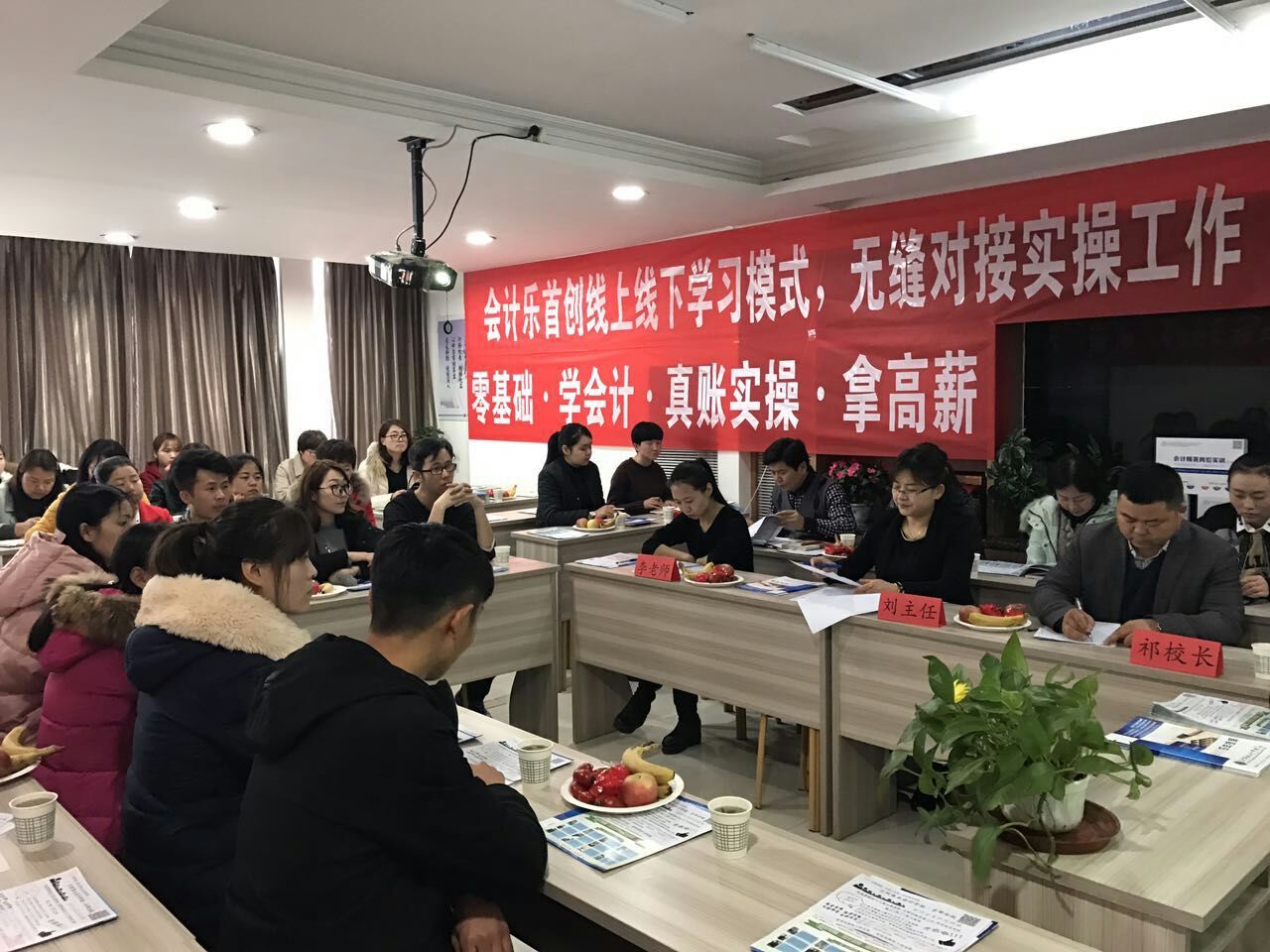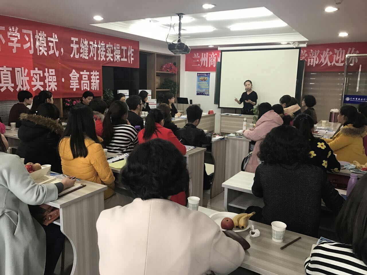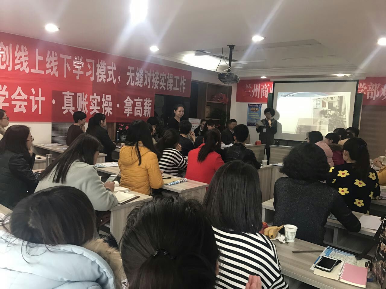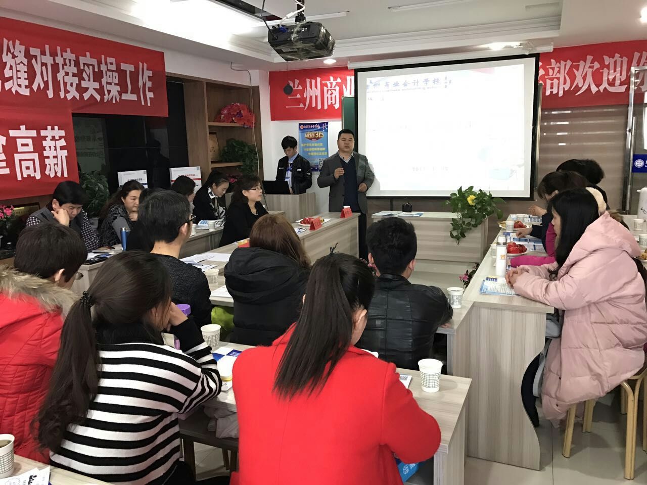 销售部刘主任以PPT的形式对17年兰州市从业暂缓考试,老板需要什么样的会计,会计的五个层次,我校对学员的一站式服务等做了详细的解答。通过生动形象的PPT课件及一张张图片告诉我们就算不考从业证,对会计人员还是没有任何影响,因为老板需要的是可以为企业创造最大化利益,而又降低成本的管理会计人员,最后强调我校以后的宗旨是重实操,重服务,重就业的一站式服务。