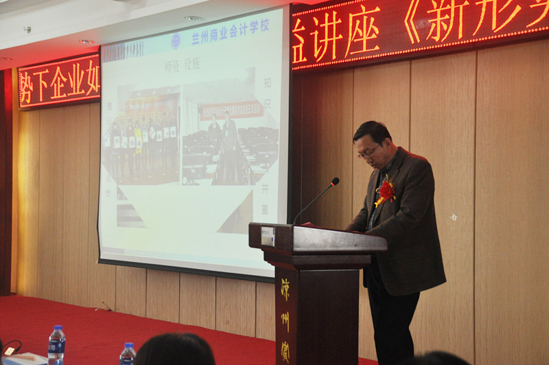 兰州商业会计学校校长祁绪在讲座上致辞,祁校长对武威市、凉州区工商联领导对学校的信赖和认可表示了衷心的感谢。祁校长介绍了兰州商业会计学校的发展历程、学校规模以及近几年在教育培训方面取得的成果,表达了学校进一步强化教学质量,改善教学环境,为社会培养更多、更优秀的专业人才,为促进武威经济和社会事业的发展贡献力量的信心和决心。
