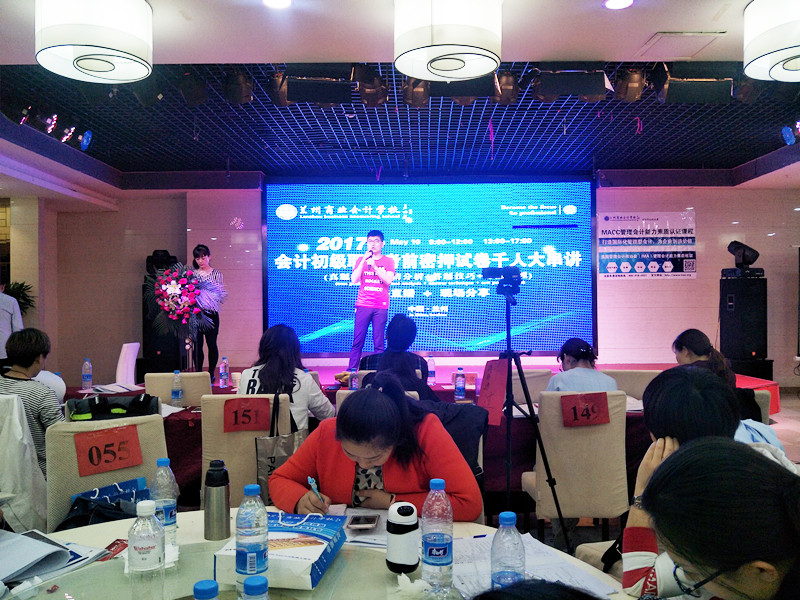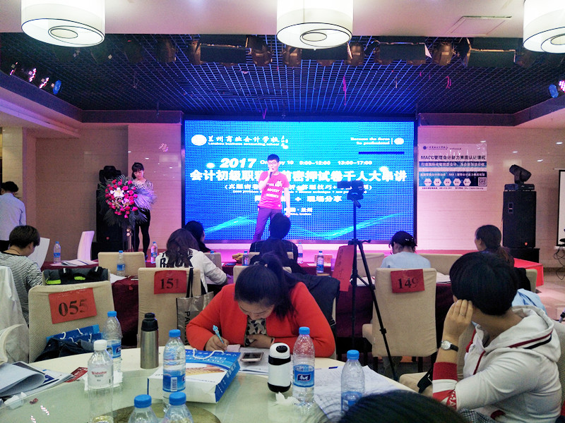 2017年5月10日,兰州商业会计学校特邀初级名师吴福喜老师莅临兰州,在伊和园酒店4楼举行2017年会计初级职称考前密押试卷千人大串讲。课程吸引了甘肃省近四百名考生前来参加,近六百人预约了学校同步直播课程和网校录播课程。课程从早上9点到12点,下午1点到5点钟,持续了一整天,吴老师为初级考生带来一场初级知识干货大讲堂,现场人气爆满,座无虚席!