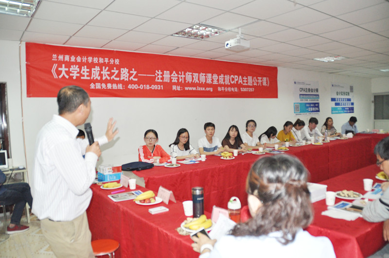5月27日,兰州商业会计学校在和平教学部成功举办《大学生成长之路—注册会计师双师课堂成就CPA》主题公开课,分别针对不同年级会计专业大学生该如何考证做了精彩分析!本次公开课邀请到了注册会计师、全国知名讲师包俊权教授、兰州商业会计学校校长、全国民营经济协会副会长兼秘书长祁绪先生,同时应邀参加的有兰州财经大学、兰州外语职业学院、陇桥学院、博文学院的优秀学子!公开课现场气氛热烈、互动不断,由于学员热情高涨,公开课比预计延长了整整一个小时!