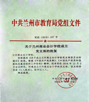 兰州商业会计学校经市教育局党组同意,于2016年12月5日成立党支部,自成立以来,学校党支部多次开展党员活动,组织党员及学校师生学习党的精神。在此次庆典活动上,全体人员起立唱国歌,表达了对党和国家的崇敬与热爱。兰州商业会计学校党支部王今强书记引领大家了解了党的发展历史和辉煌巨变,了解了兰州商业会计学校党支部的成立和发展过程,同时展示了兰州商业会计学校党支部活动风采。