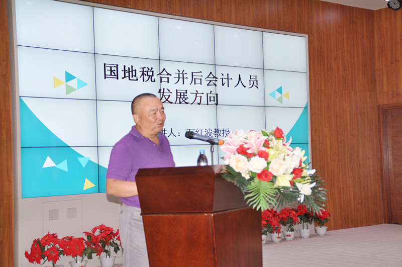 全国会计领军人才、兰州大学教授及硕士研究生导师、澳大利亚国家职业会计师(IPA)、中国资深注册会计师、甘肃省注册会计师协会常务理事万红波教授则以“国地税合并后会计人员发展方向”为主题,通过对“税务改革”“国地税合并的影响”“十大重大会计变革”的阐述与分析,指出了目前税收政策及发展背景下会计人才需求的变化及会计人员的发展方向,万教授强调,由于大数据时代的到来,需要财务人员不断提升自身素质,改变传统的工作方式,充分利用企业的会计信息技术,为企业未来的经济活动进行有效的预测和分析。(万教授讲课)